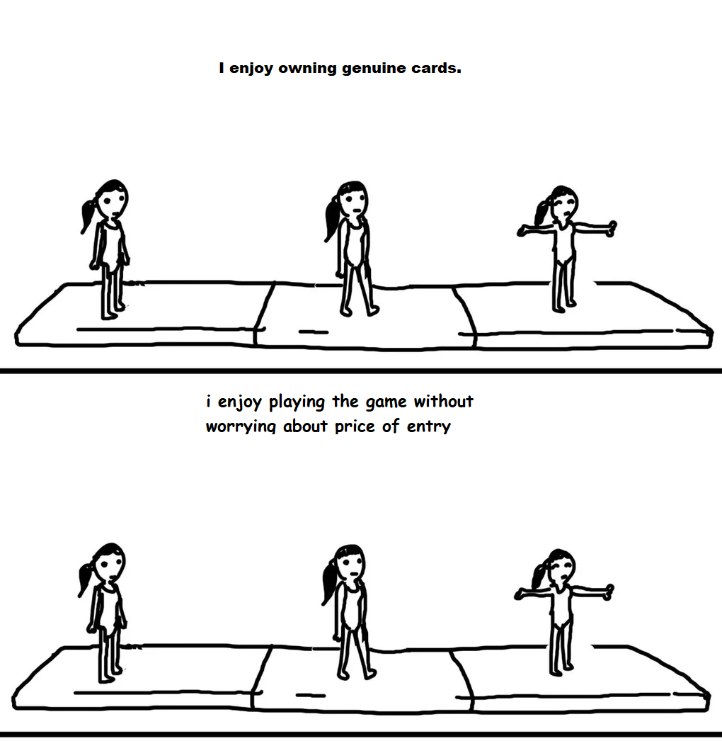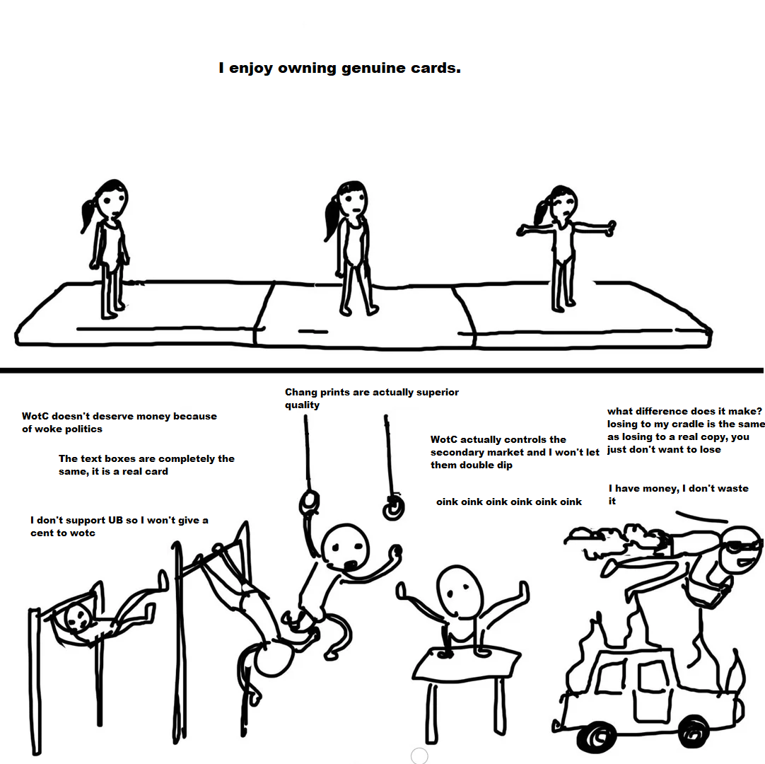 >>97628370Unfortunately yes. Pressure from sunken cost retards drove my LGS to ban proxies. I was arguing with one of them who said proxies could be used to scam people, when I showed him one with a white back and asked "do you really think you would be fooled by this" he adamantly insisted he would. I said "either you think you are a retard or you think I am" and it kinda escalated from there lol.I just counterfeit now anyways