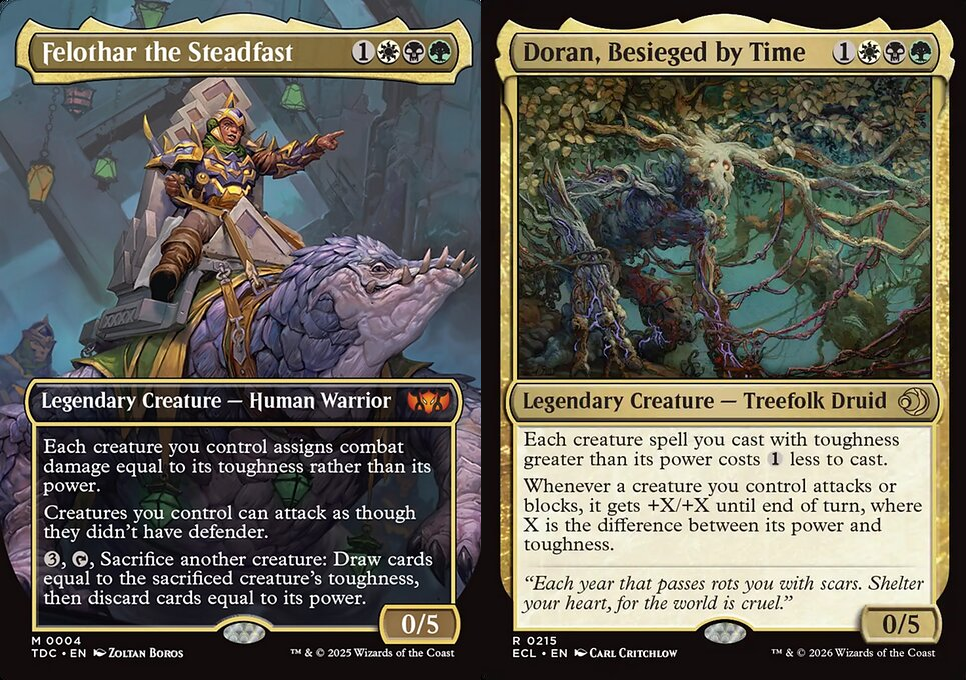 >>97627067For specifically defenders go with Felothar but for Doran you have to build him different. He's not just a big toughness deck, he's a difference deck. Its difference between Power Toughness. I built him around the toughness creatures but also a bunch of creatures with high power and low tougness. Making Yargle a 30/18 is fun