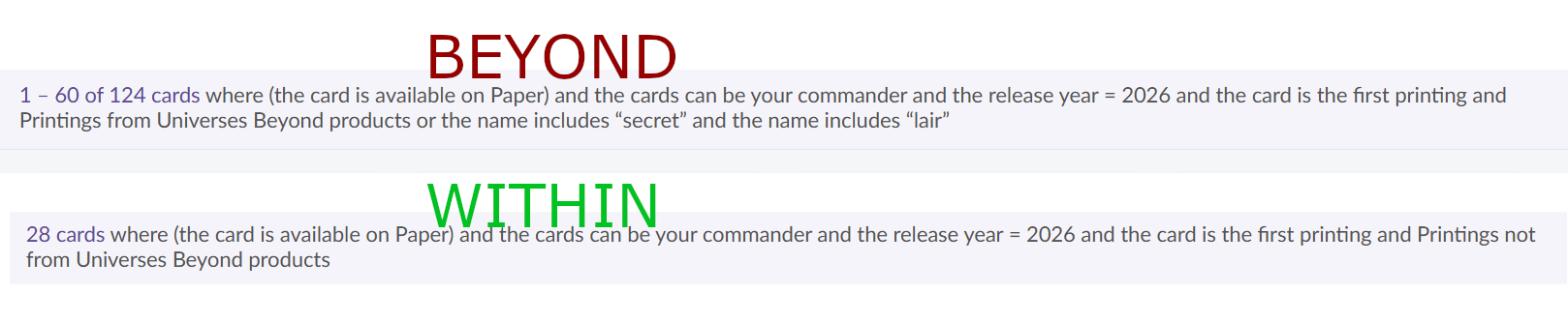 So far in 2026 124 Universes Beyond commanders have been released or spoiledAs for Universes Withinthat number is 28Universes Beyond is +96 in terms of commanders so far through 2 months of the year
