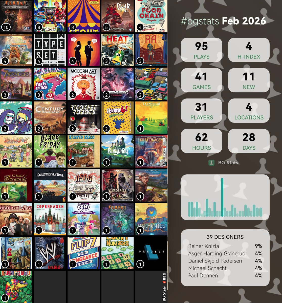 >>97640084>5 counts digitalClank!>2 counts physical, 1 count digitalTargi>3 counts digitalWispwood>2 counts physicalMushroom SortWeb of Power>1 count physical, 1 count digitalClaim It!>2 counts digitalCartographersCodenamesDouble NineDungeons & Dragons Adventure SystemLimes>1 count physicalBetween Two CastlesConcordiaEGOGalactic RenaissanceHorseless CarriagePinatasRace for the GalaxyRailroad TilesRebirthSagrada>1 count digitalCarcassonne South SeasCarolus MagnusDale of MerchantsDragonheartLucky NumbersModern Art>honorable mention2 digital counts of Port Royal that started before February1 digital count of Pax Porfiriana that started before February1 digital count of Chakra that started in February but has not ended>Played any gems?Dale of Merchants was very good.Targi, Web of Power, Mushroom Sort, Race for the Galaxy, and Carcassonne South Seas are all very good. But I knew that going into the month.D&D Adventure System was good. I generally dislike co-ops, so that surprised me.Between Two Castles is good and it might be better than than Between Two Cities, I am not sure yet.Wispwood is probably not better than Cartographers, I am not sure yet, but it is good.