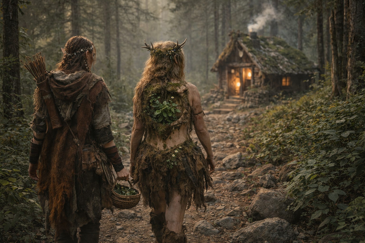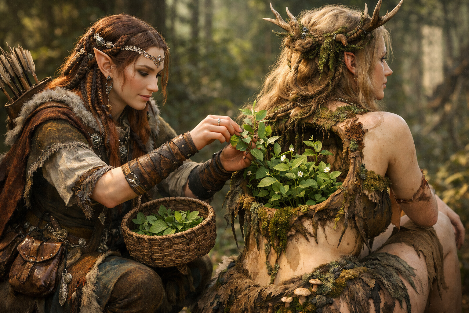 Two NPCs from my DnD game. Emfrid the wood elf lövjerska (lit. "leafstress", an old swedish word for female herbalist healer) and her friend Hedendis a Huldra that isn't too fond of people, but has become close friends with Emfrid to the point of letting Emfrid place her rarest plant in Hedendis' hollow back for safekeeping.