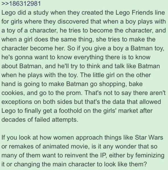 >>97634267In recognition of leading sexology research, my overtly gynocentric setting baiting it revolves around dominance and status preferences rather than primary sexual characteristics, such that it is actively taboo to be seen pursuing or taking any kind of following role of one of lesser wealth than yourself. Thus there are no distinct "lesbians", because it is simply not noteworthy for a woman's interest in another of greater status to extend to same-sex carnal matters.>>97634573It's hardly comprehensive, and largely fueled by a willful ignorance of how and when the preferences are set to posture greater legitimacy of sexual orientation as self-identification. I find it just as silly with the 7-9/10s who's cock is the carousel to be ridden hyping themselves up for "having game" or however they put it.>>97634901There's plenty of narrative considerations that choosing the opposite sex has meaningful impacts on worth exploring, just because you're too (anti-)coombrained to accept any of them outside the gutter doesn't dictate that's the limit of them.>>97634918To my understanding, it's more a slip-of-focus and curiosity thing, the former being that a staggering amount of porn has the female being ravished as the most empathizable thing by a large margin and the latter just a subset of general fantasizing of things not directly attainable, and thus there's a general pressure toward it.For me personally, non-anthro MLP and Pokemon saw enough of my attention on outright inhuman anatomy from the get-go that I can easily get "on rails" for a monster doing the fucking out to very weird and outright abstract fetishes.>>97635556WHAT neo-nazi bullshit? There are other actually-conservative flavors of "right wing", anon!