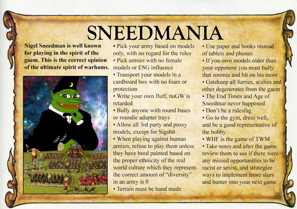 >>97634588>What would 11th even look like? Things are as shrimple as they could ever be!I have already talked about this, but mainly I can see two possible ways for GW to go.1) New Coke11th slowly reintroduce stuff that GW has removed from 40k, making a big deal about it and ignoring the fact that it was them who removed it in the first place. Expect multiple articles about how cool and thematic this absurd new concept called a Force Organization Chart is. Or how incredible is the fact that equipment is now going to have points. 2) Even more shrimplificationGW decides to go even beyond in terms of making 40k a boardgame and the super entry point for the hobby, and they basically turn 40k into Combat Patrol.