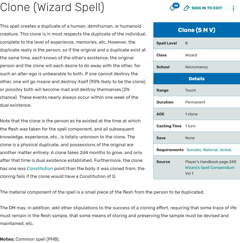>>97695681Epic 3.5 Wizard-Archmage who canonically got killed and replaced by his own clone. There's an 8th level spell called Clone in D&D that just straight up lets you grow a body in a tube that you can possess upon death, but it's also alive and mentally that person under a stasis effect. You also have to undo the stasis when you die with some preprogrammed method, or die permanently and awaken the clone to be independent. Shenanigans. Doesn't work on species that develop slowly. It does, but it takes extremely long times. Dragons can't use it. Whole plotline about that.