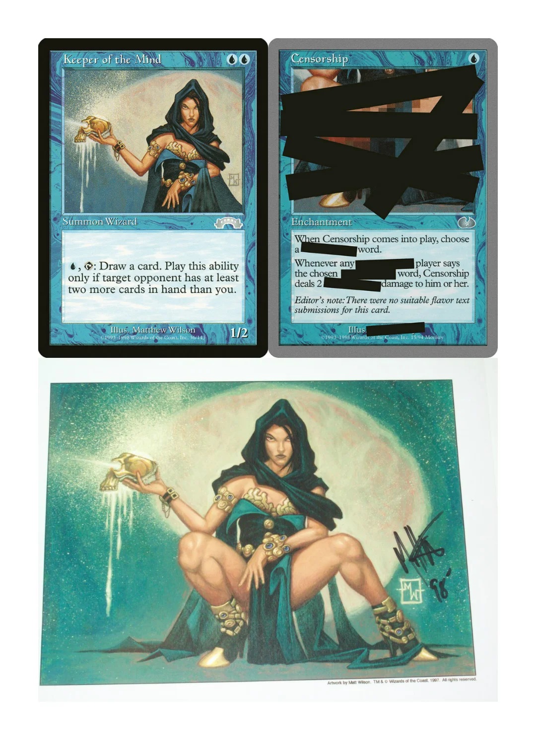 >>97664605Dropped it into MEGA>https://mega.nz/file/UggVRBrD#Bod7k9oS8KVNBCfh3oV3Ehl8mZRllk-a3J0Xqf97LBsHere's another piece of Magic trivia: the original art for Keeper of the Mind (Exodus) was rejected as "too risque" and had to be edited. The original image (with varied forms of censorship) was used for the card "Censorship" in Unglued.