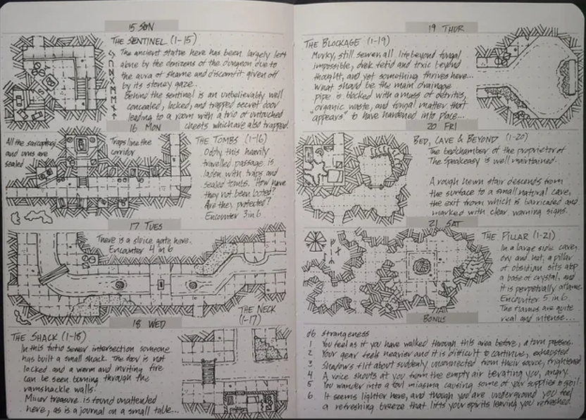 Write a room 6 days a week and then use the 7th to design a unique monster, faction, or artifact that ties into the cluster or one of the rooms you wrote that week.