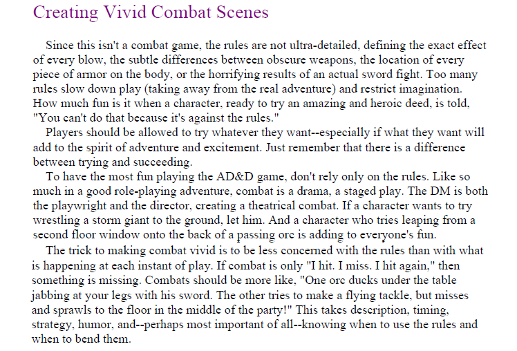 That's a complete strawmanned rewording of what it actually says, which is to allow a character to attempt something in combat even if it isn't detailed in the rules, or bends them in reasonable ways. That's not "imagining" anything, that's grounded in-game consequences for player-imagined actions. Why are you being a fuck-stupid nigger-tard? Very strange.