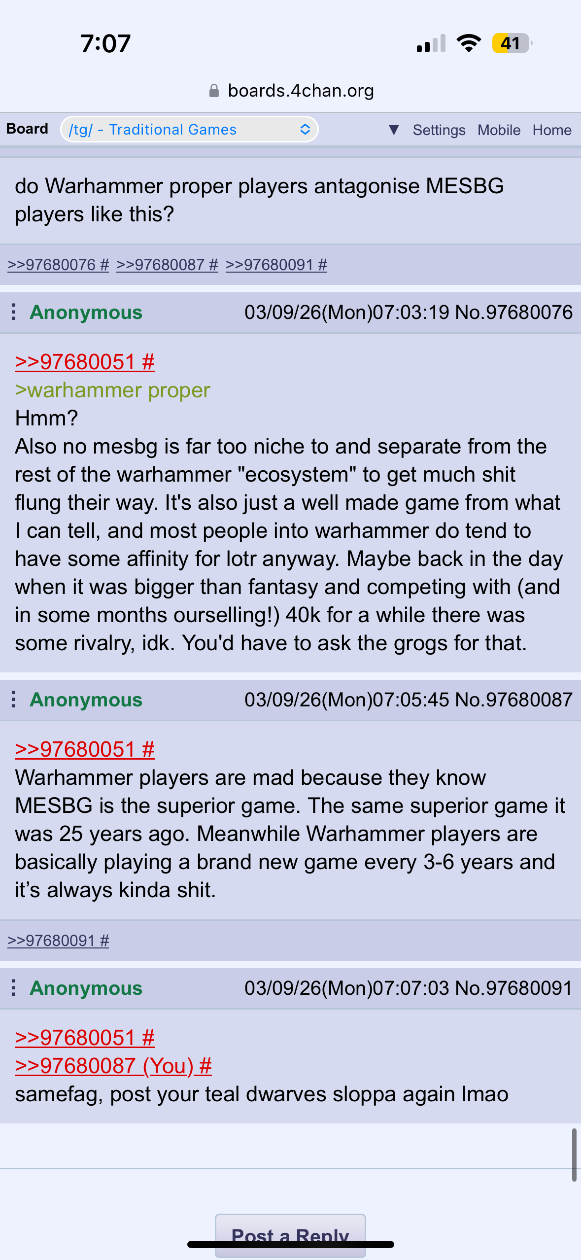 >>97680087>Warhammer players are mad because they know MESBG is the superior game.Pratically nobody ever talks about mesbg and when they do it's usually in praise thereof. This is something really odd to manufacture