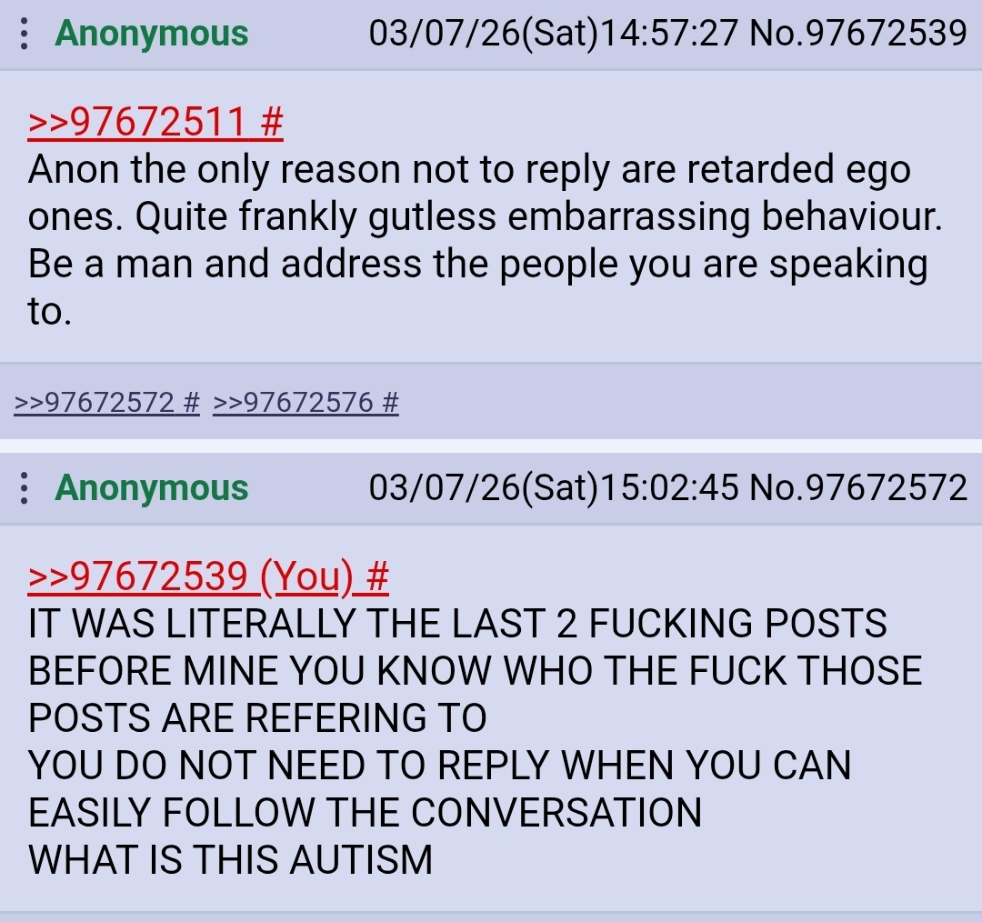 >>97672460>defending someone who seethes at a 2 word post and says its lashing out>>97672428>YOU DIDNT REPLY TO THE RETARD WHO WAS LITERALLY THE LAST 2 POSTS RIGHT ABOVE YOU YOU HAVE NO BALLS!!!Will always be some of the most fucking moronic autism people have on this sight. (You) hungry slobs