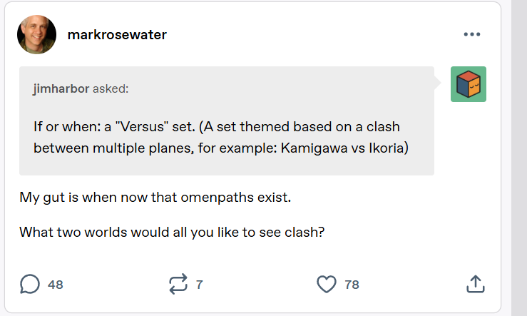 >>97671938>TQ: What is your favorite MTG plane?Lorwyn or the easy answer of Dominaria. Not a fan of theme parks.