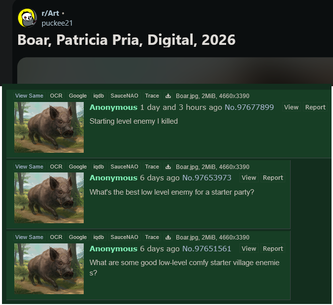 >>97684133>puckee spamming his commission againhttps://www.reddit.com/r/ImaginaryAnimals/comments/1rjuhwm/boar_by_patricia_pria/https://desuarchive.org/_/search/image/gLH9OMs8P5G48Gjpf3RMCg/https://desuarchive.org/tg/search/image/iRRE_rljYR2Gbx0q49XWHg/>combined 6 times since February 2026