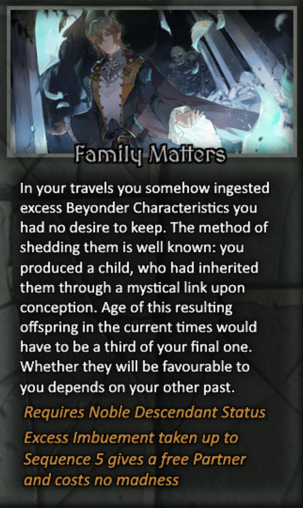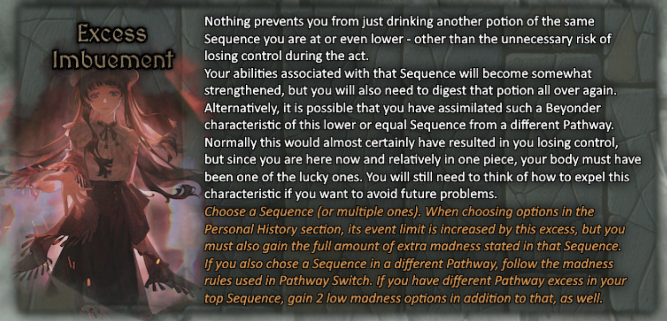 >>97684791What I have so far. Not sure how to the sequence/life history section works.>>97680248>>97682725>8, 24, 55Origin: Mothers Little Reincarnator>Wealth (Y), 23>Knowledge (B), 17>Influence (P), 20>Coincidence (G), 12>+1 Abyss, Chained, Moon, Mother>True God's Seal>Heightened Risk of Outer Diety corruptionFates:-The Magician (Past)>Discard 2 low madness options for free-The Hierophant (Present)>Discriminated against within my Organization-Justice (Future)>+3 VisionaryBody: Male>Lucky, +1 Y & G>Trustworthy, +1 P & G>Well-Spoken, +1 P&BStatus: Official BeyonderRegion: Feynapotter Kingdom> +1 Mother & JusticiarSecret Organization: Church of the Earth Mother>+2 Mother, +1 Justiciar & Twilight GiantPathway: Planter