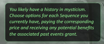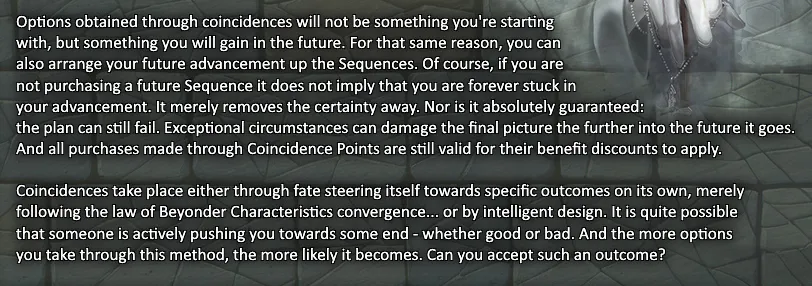 >>97688550>>97688566Thanks guys.I think the reason people get confused about this is the wording of picrel.>Choose options for each Sequence you currently haveKinda implies we've already unlocked some Sequence levels at this point throughout the CYOA.When what it's really saying is;>"Choose which Sequence level you're starting at">"Then you can spend Coincidence to help you unlock further Sequence Levels after you 'start'