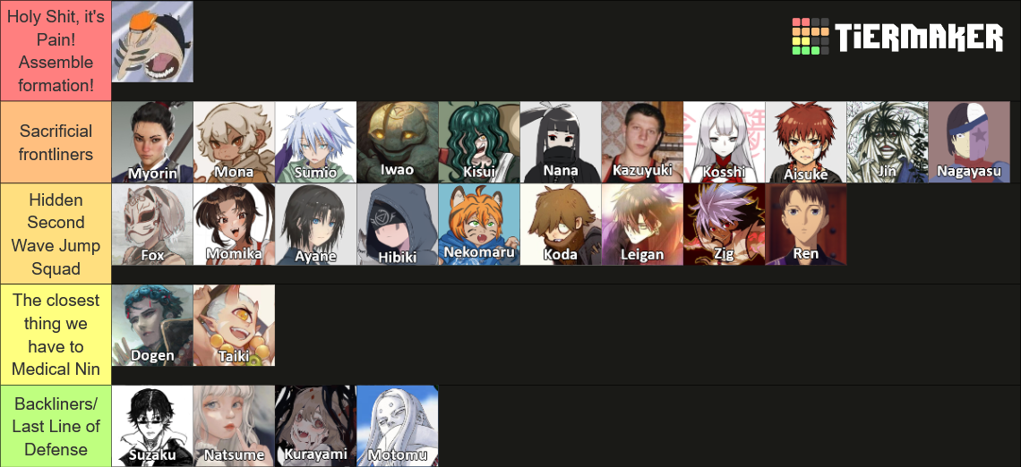 >>97684966AND HERE YOU HAVE IThttps://tiermaker.com/create/naruto-getsugakure-run-17629646I have to draw Kazuyuki a new faceclaim. Won’t go further than this weekend, trust