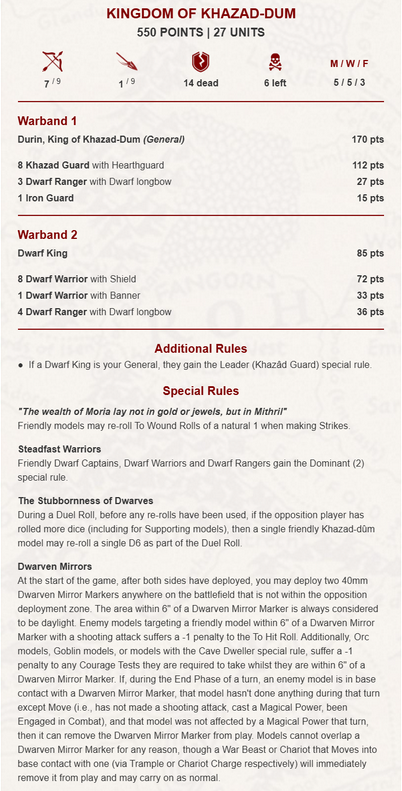 >>97688129The Dwarves of Moria cinched a very very close game, winning 5-4 against a very nice opponent. I misplayed quite a bit especially around Aragorn, he is insanely good. I kind of want to start an army with him as the general now.