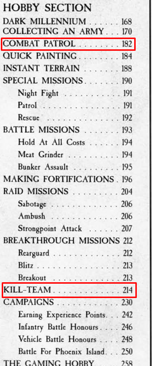 >>97697270>>97697164I'm talking about combat patrol and kill team from 4th edition rulebookAs you can see in the 4th edition table of content. Heralds of Ruins was a fan made thing that basically took elements from things like >>97697042 and the old Combat Patrol and Kill Team rules to make something similar to Necromunda and Shadow War Armageddon