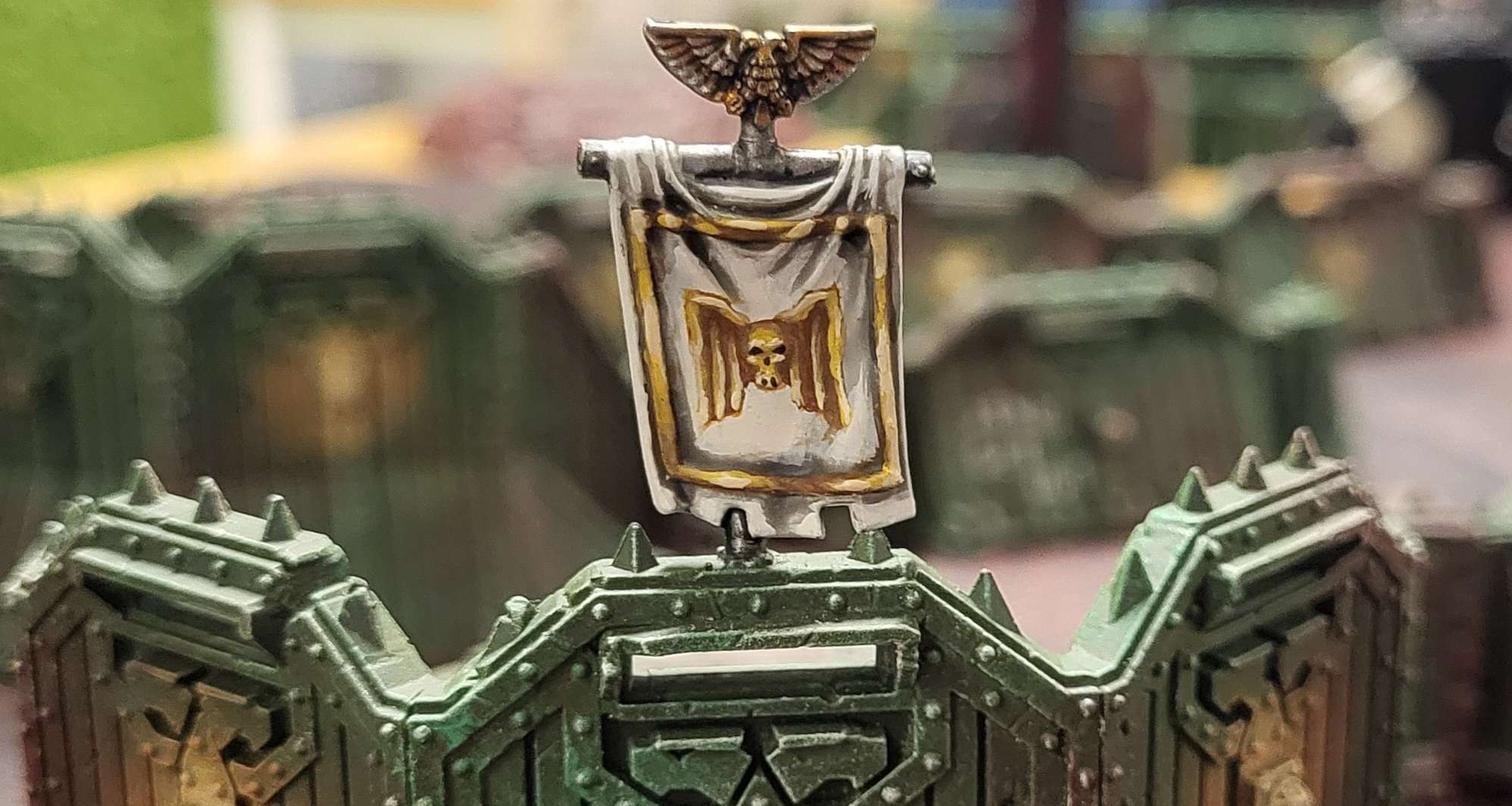 Took a break from painting my tomb world today and managed to (almost) fully paint the entire nu-aegis defense line set I also had in one go. I placed a banner on one piece which remains blank for now but once I decide what goes on it I'll be filling it in.I've grown addicted to making these little freehand decorations on terrain and man did I have space to add a lot of them on this set.