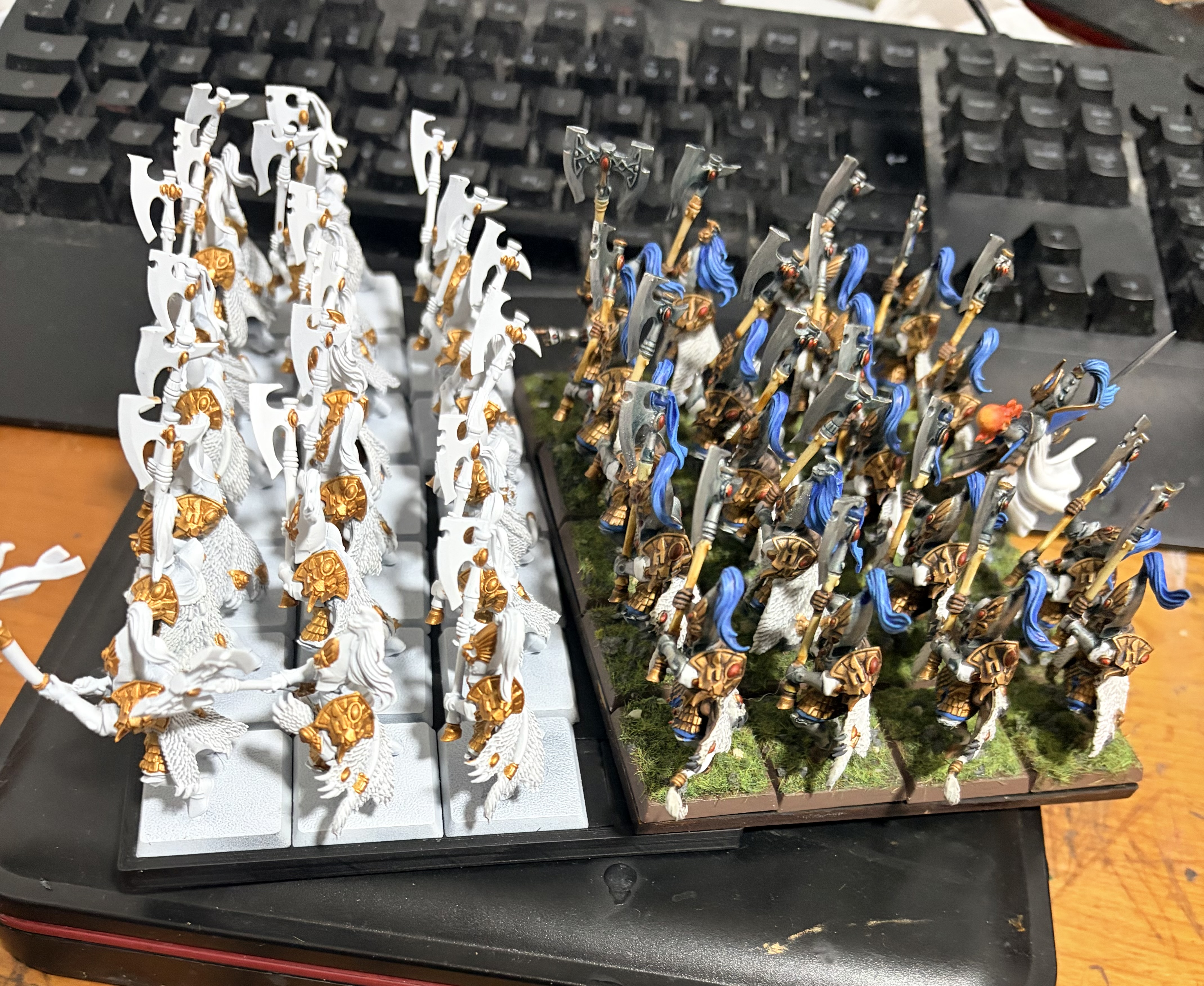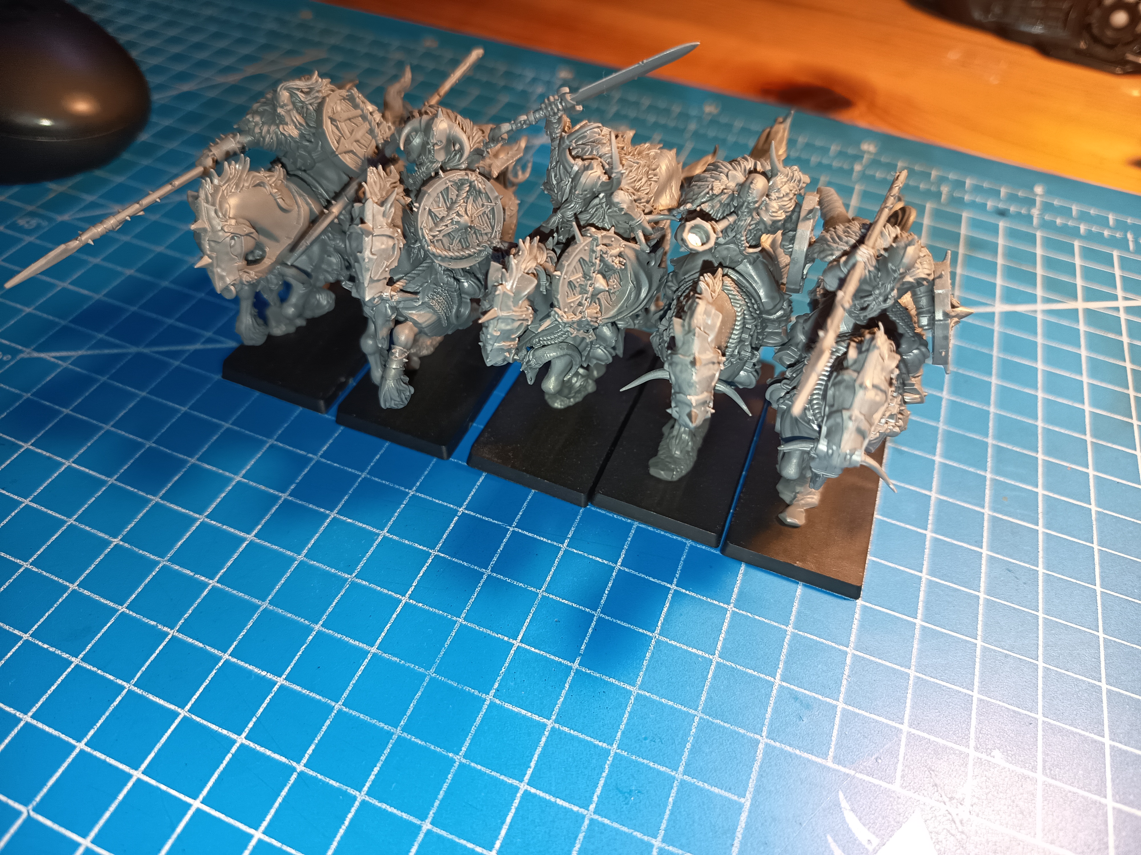 I tried to put these new marauders on old bases, figuring that enlargement trays won't cost me much money and would be best of both worlds, but rn I'm not really sure anymore. They kind of-sort of fit together in right configuration, and I could maybe squeeze a few millimeters more out of them if I experiment some more with placement, but even so they basically touch one another in multiple spots and in other configurations they don't stick together well at all. Granted it is really not that different from what many units already suffered from under old basing scheme. On the other hand I doubt anyone I'd play wfb would care very much if they were on larger bases. IDK, thoughts?