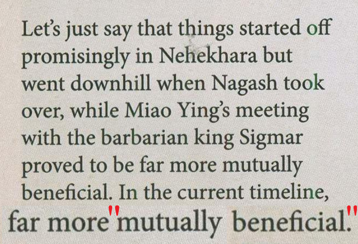 I really liked the fluff snippets from the 6th edition vampire counts and hordes of chaos books, which had small things like skaven wondering why humans bothered to bury their dead and thus waste food and a norscan casually explaining that they keep their chaos spawn locked up in a cave and see them as a sign of favour from the gods.