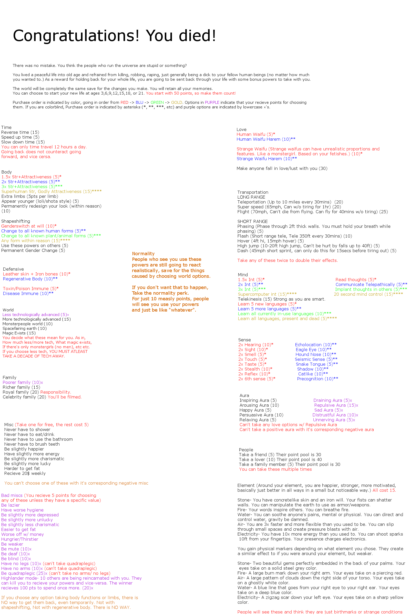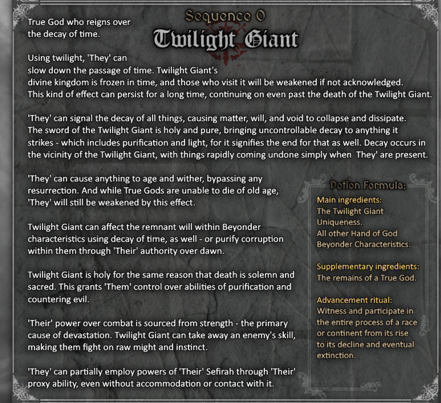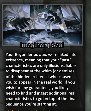 I think it's ambiguity in the terms of what is nessesary to advance. It seems some people believe you need beyond your characteristics on top of potion ingredients to secure advancement. I've never read the series and know nothing about it outside of this thread, but my reading of it seems to say that it's not strictly nessesary for most people. The cyoa is terribly vague to me, without clear advancement instructions, outside of hard locking it in with the personal advancement section. At least to me if you get a beyonder characteristic as a fake person, you can lock yourself into reality.