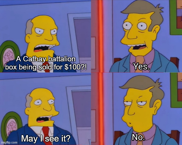 Anyone who was interested in Cathay proxies. It seems the Cathay battalion is listed as out of stock online. Meaning it won't be restocked. This was supposed to be an evergreen box, so this may mean something is coming that replaces this box.So if you have a FLGS with stock, and you thought about getting proxies, this MAY be the time to strike.