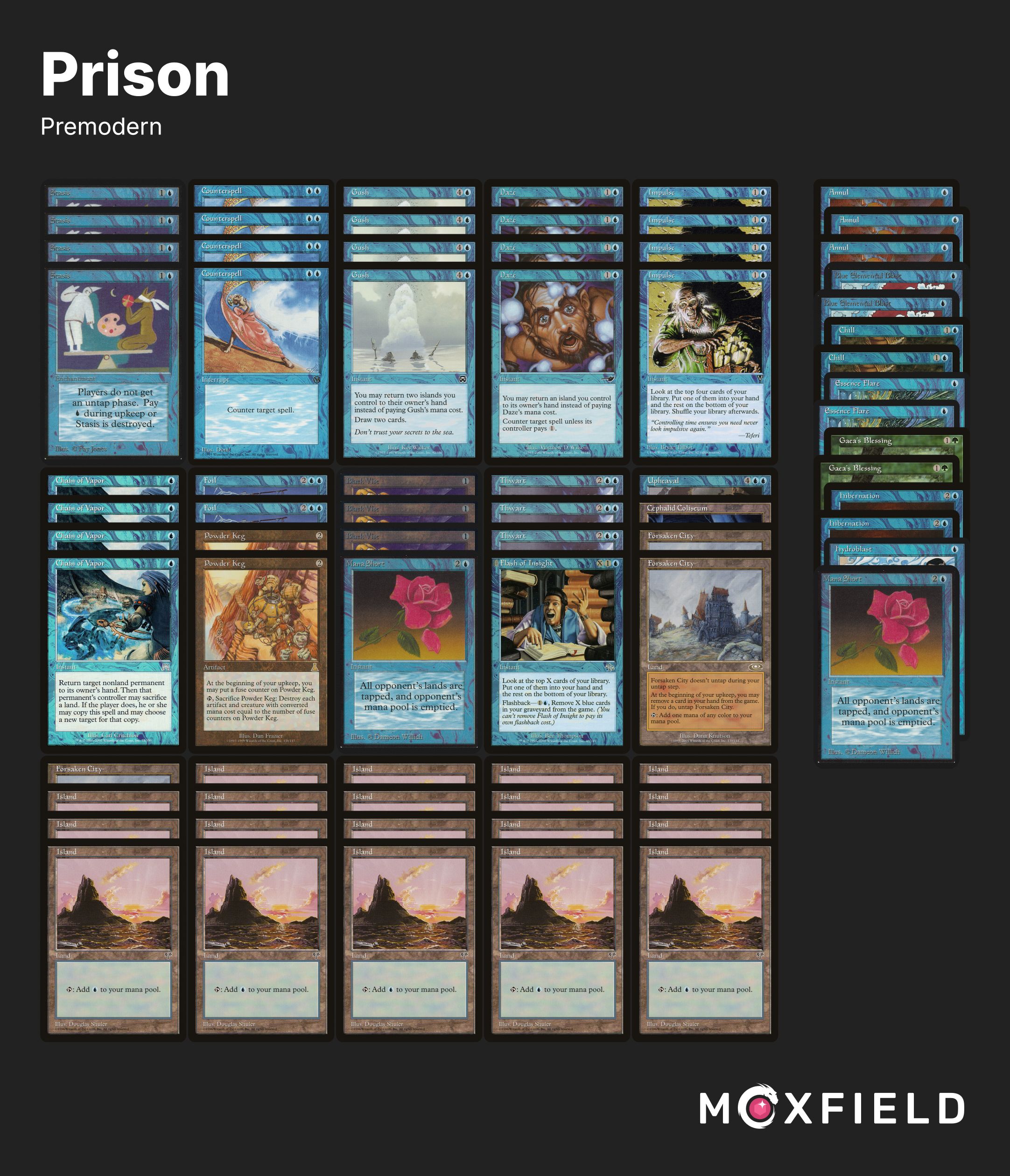 I'm playing Stasis at premodern tomorrow just netdecking Firetruck and trying to shoehorn in 1-2 Cursed Totem somehow.Should I cut Cephalid Coliseum or 1 Island for a 4th Forsaken City or just stick with 3?Should I have a sideboard Brain Freeze or a maindeck Stroke of Genius?I expect at least one of each of the following: Stiflenought, Reanimator w/ sb Oath, Esper Midrange, FEB, Replenish