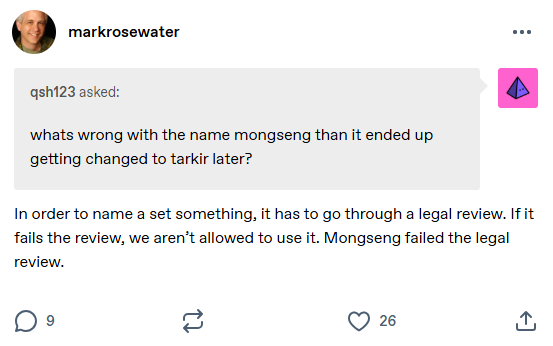 >>97709597Mark said Monseng is Tarkir and they are never going to use Monseng anyway because of the offensive name.