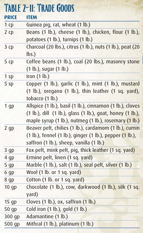 Who wrote this shit? Why do the ingots weigh nothing? Matter of fact, why do so many things weigh nothing? A week of horse feed, a brick (or presumably 1,000 bricks according to the trade goods table), a bale of cotton - what the fuck are these things supposed to weigh under PF2e's retarded "bulk" system?