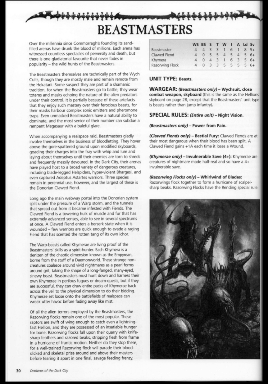 >>97710651>TQI play Dark Eldar, so I'd want a swarm unit of drugged up slaves used as fodder. Orks, humans, Tau and so on, all stripped down, given clubs and pumped full of combat drugs then loosed on the enemy.