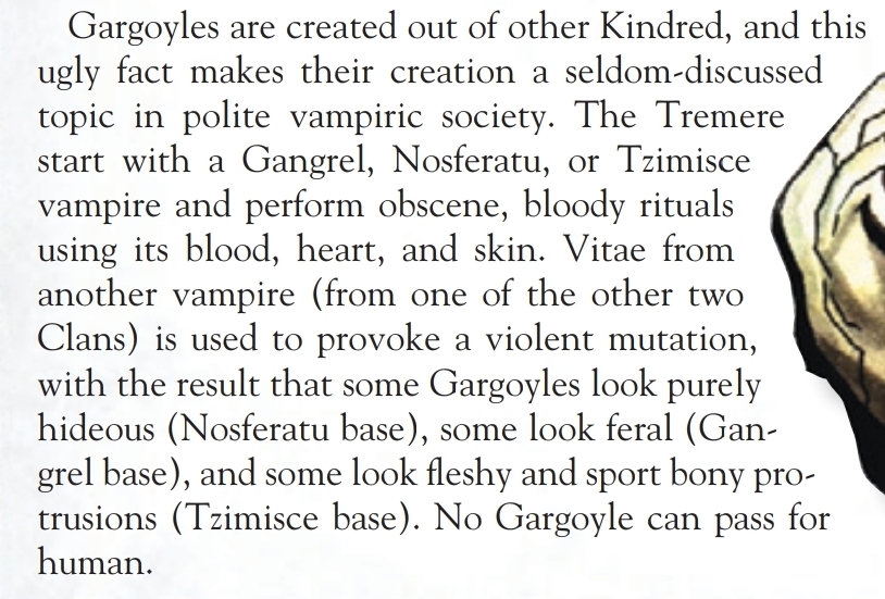>>97718675nta but some clans are more inherintly mutable not just because of disciplinesgangrel for example are mentioned to be "mutable" because of their vitae which not only makes them gargoyle material but is also meant to be the reason why they have the most bloodlinesnosferatu are mutable not because of a discipline but because of their clan curseand tzimisce blood makes ghouls easier to fleshcraft even if said tzimisce had zero dots in vicissitude or is a old clan