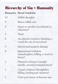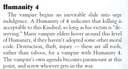 >>97723265>>97733778Reaching humanity 4 means that you no longer have to roll the dice to see if you lose humanity whenever your character kills someone who they think it's deserving.Funnily enough, that can include an unveiled woman if you decide to play a certain archetype of Assamite or even a good natured kindred who learned thaumaturgy if you are playing Tremere. Hell, you could probably justify killing "boot lickers" as an anarch Brujah and maintain 4 points in humanity.