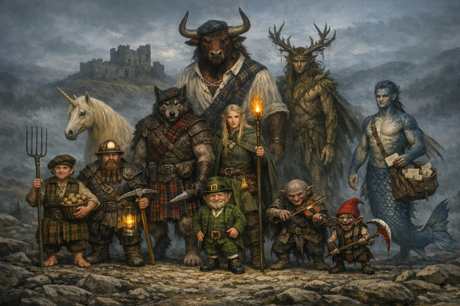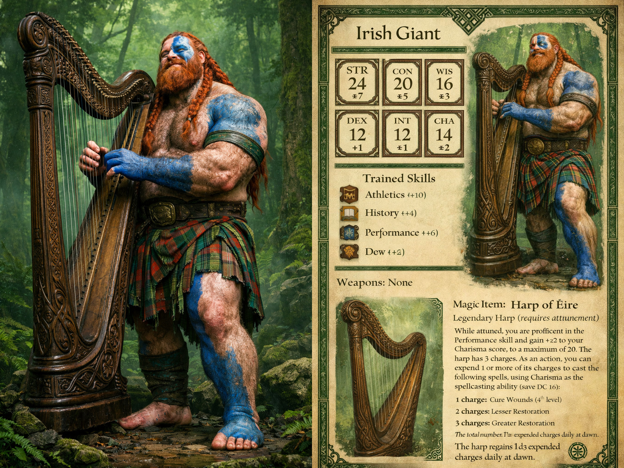 >prompt for character sheet from the image>half of character sheet is a description of the magical harp