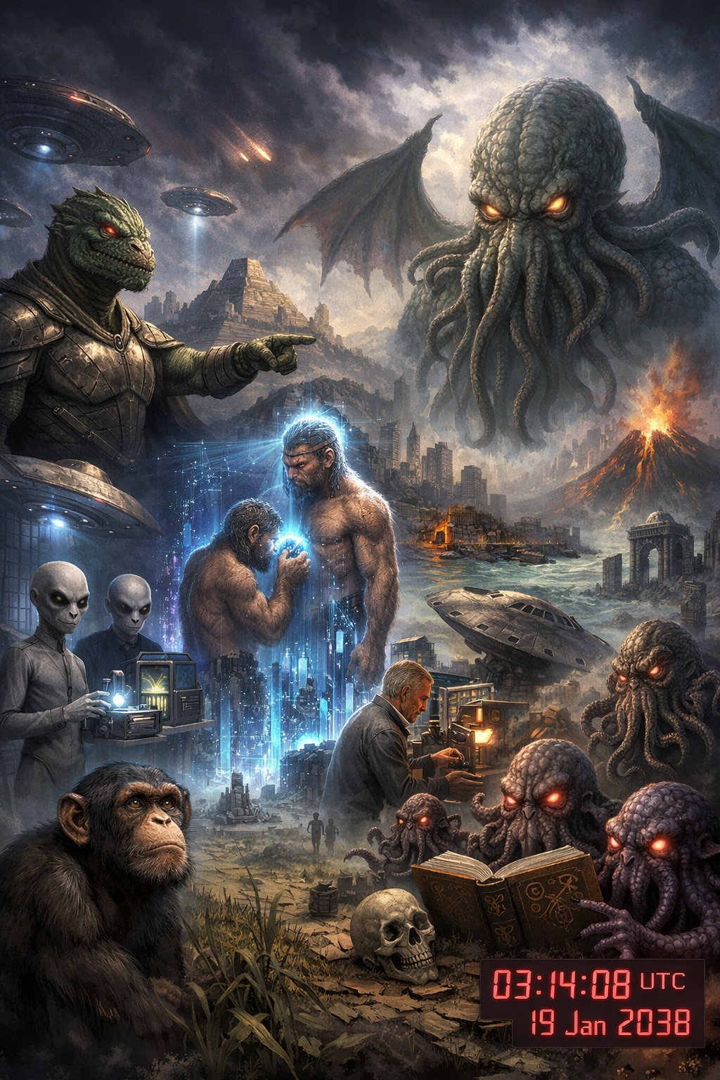 What if all the lousy new age writers were right? Consider the following: during the Eemian period Aliens were grooming and uplifting Neanderthals to have them conquer the Earth and later extract orgone from their brains. Now aliens are back and to their dismay it was their pesky war-ike cousin Homo sapiens that conquered the Earth and our orgone is of inferior quality (not to mention our brains shrank by 15% during the development of agriculture – yes, we domesticated ourselves!) and Cthulhu whose crash on Earth sank Atlantis and caused Bronze Age collapse (when I say all writers are right – I mean it) poisons it by its continued presence. Thankfully Aliens are split: Reptilians are "just extract this planet and move on to Wolf 359", Greys are "let's try again with bonobos" while quietly influence the technical progress (did you really think humans invented transistors on their own? – yes, Roswell incident and first presentation of transistor are *awfully* close in time) and Cthulhoids are frantically trying to figure out how did the Lovecraft figure **them** out and await 03:14:08 UTC on 19 January 2038 when Cthulhu wakes up [humanity time ends, the Great Old Ones' time begins. Yes, cheap symbolism.](Verification not required. Am I unto something?)