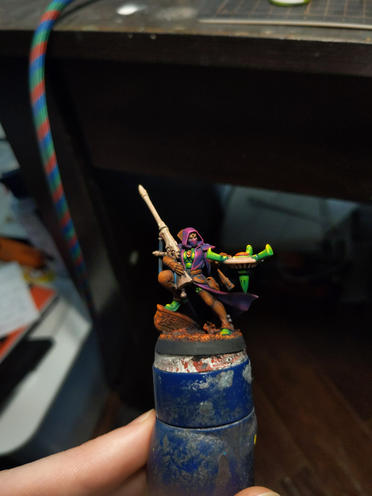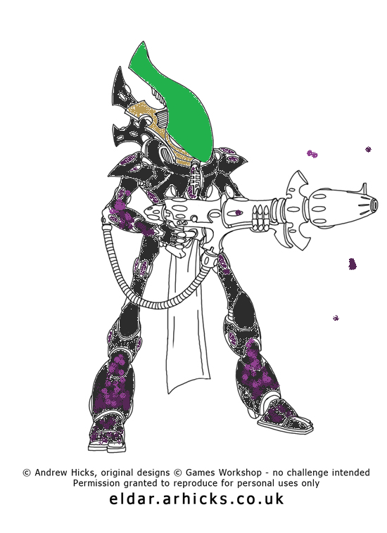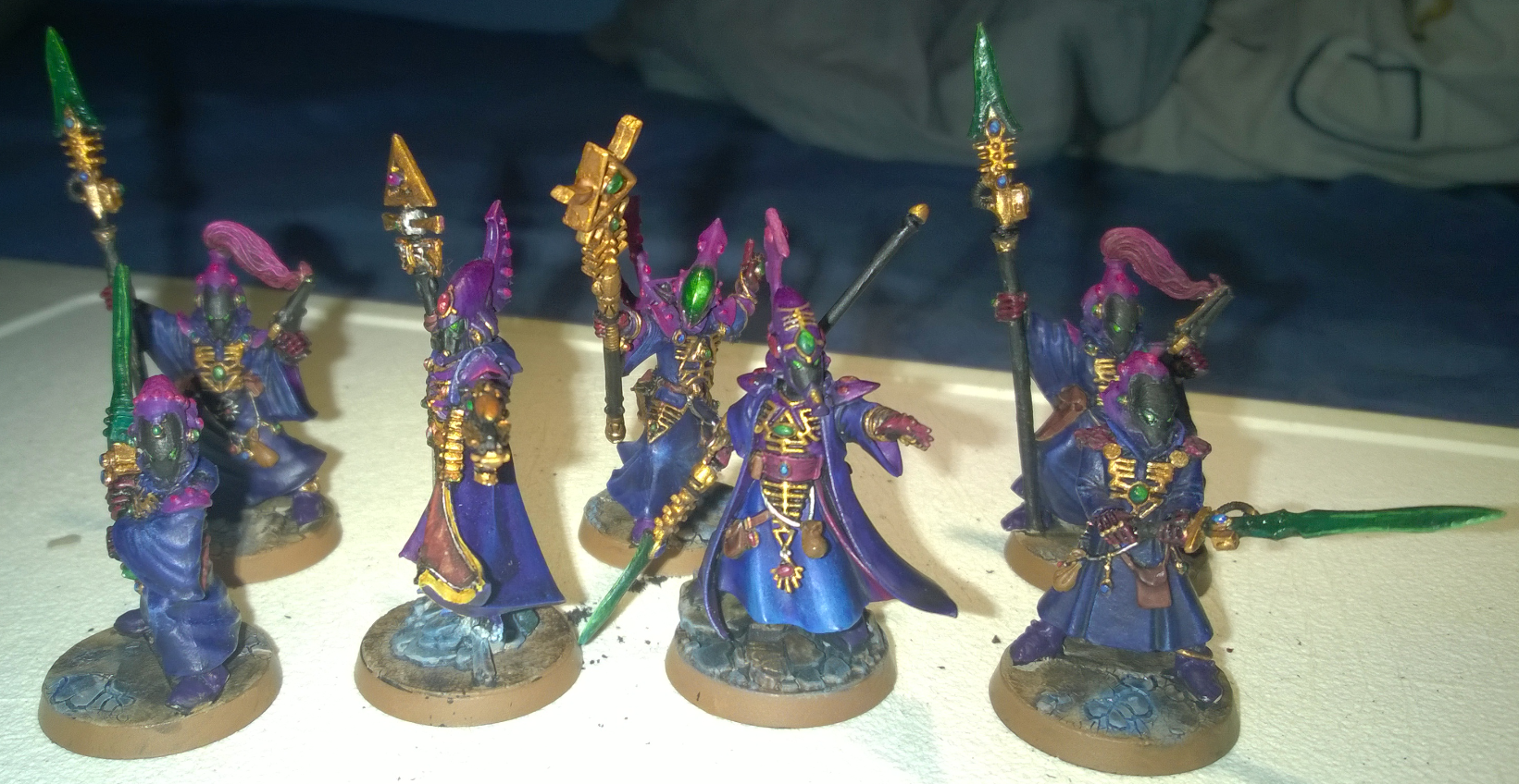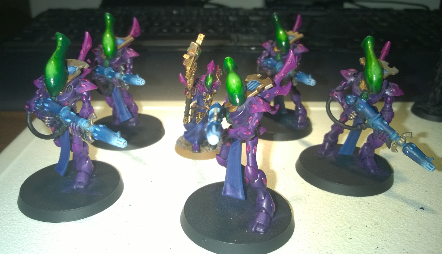 >>97724342>I can't figure out a good contrasting color for the weapon.sHear me out, you tried a gold or bronze looking wraithbone colour? Could also try rune patterns in the green you're using to break up some of the large purple spaces on the bigger models.