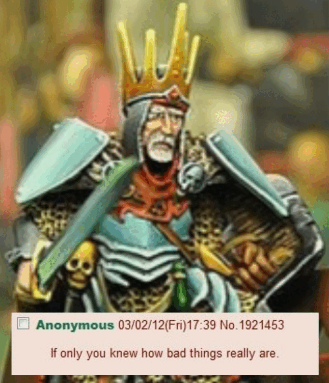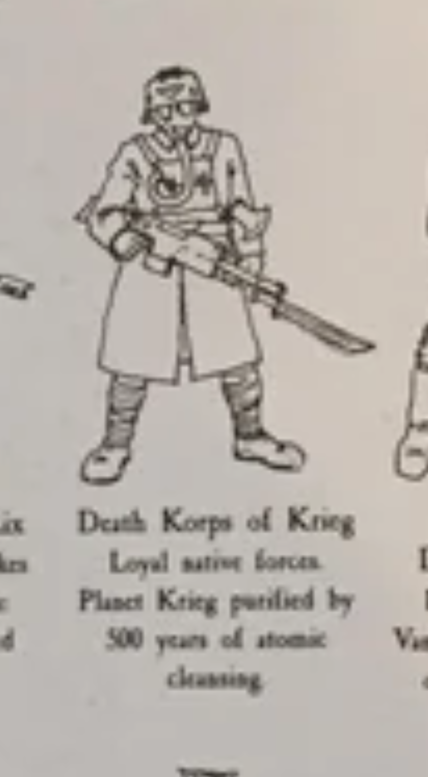 >>97726046that poor Krieg guardsman looks utterly bewildered when he says that>be Death Korpsman>get shipped off to Armageddon>watchmaster assures you situation on the ground is dire>fuck yeah me and the lads are finally doing our bit to atone for Krieg's many sins>land on the planet>just as we wished the situation is hopeless and we expect to die for the emperor there>hear imperial commander's voice over the vox caster "There is no victory to be had here. I cannot ask you to die in the mud of a world that was lost long ago.">look to the comrade on my left>"dude what the fuck">look to the one on my right>"you hearing this shit too?"