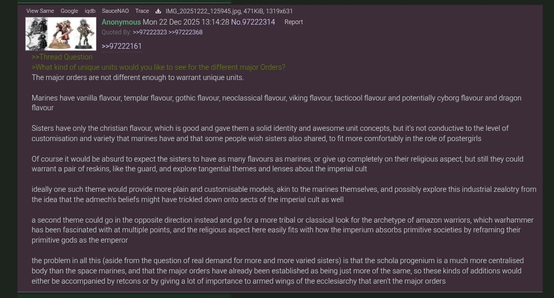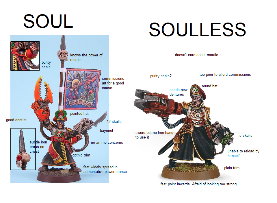 >>97745405Lame excuse to not put in any effort.We have three major and a lot of minor christian denominations. It would be very easy to build upon what they already have and give each Order something to fit their identity. Even if it is just a visual distinction, as it is with most Space Marine Chapters too.The reality is that anything outside of Marines has it extra hard to get anything more individual, simply because GW doesn't want to do the effort without any guarantee of success.We just had basically the same debate about different Guard regiments. GW won't make new kits for sub-factions that won't rise the sells. If not having specific models for a sub-faction has no impact on sells because people just buy the generic ones.. why bother?As with all lore justifications: in the end they don't matter. GW will change anything standing in the way of expected profit without wasting a single thought.