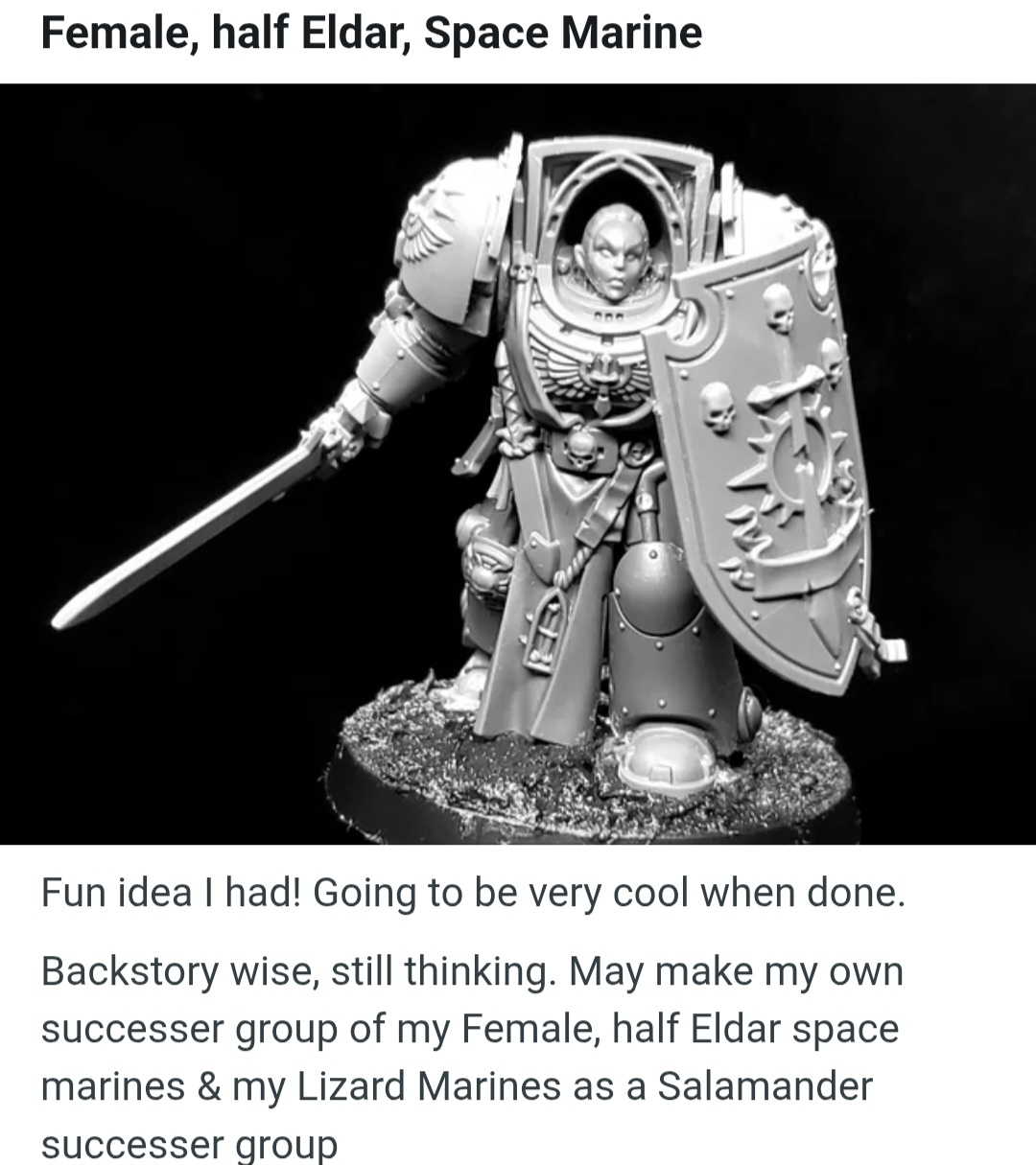 >>97745335>regular human guardsmen share the same physiology between sexes, female being dudes with feminine faces>genetically engineered super-soldiers in heavy power armour got male and female body typesI'm glad I got all the Custodes I'll ever need.In non-schizo news, did they ever talk about why they switched the vents on the back from two to one? The dreadnought kept the two vents, but all the normal suits now got a single vent. Almost looks like you could file it down and use it to mount a power pack on it.