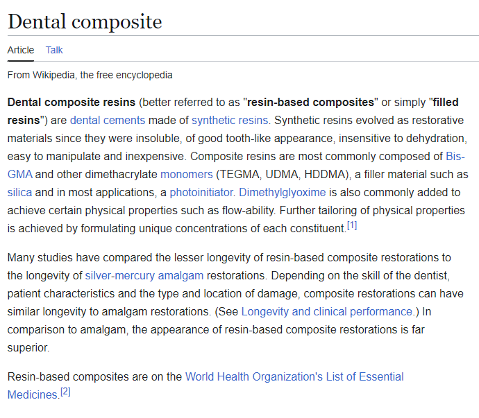 >>97790406They do use a UV-curing resin. But there are more than one of those, even the various types of resin sold for home printer use aren't all the same stuff, so that the dental stuff is safe enough in the way they use it alone isn't much of a guarantee that any given brand of our resin is safe the way we use it.>>97792933For the purpose of this discussion he can actually ignore the word composite there. A composite is simply a mix of two or more materials. In the case of the stuff the dentist uses that article tells us that it's usually a mixture of some photocuring resin and a silica filler. Now if the resin side is horribly toxic then adding some silica to it is highly unlikely to change that, just like adding a few handfuls of resin desiccant beads to a bottle of Elegoo ABS-like is unlikely to unlikely to make that any more or less toxic than it already is. So we can ignore the filler additive here, and thus we're not looking at a composite any more, just one of its components on its own.
