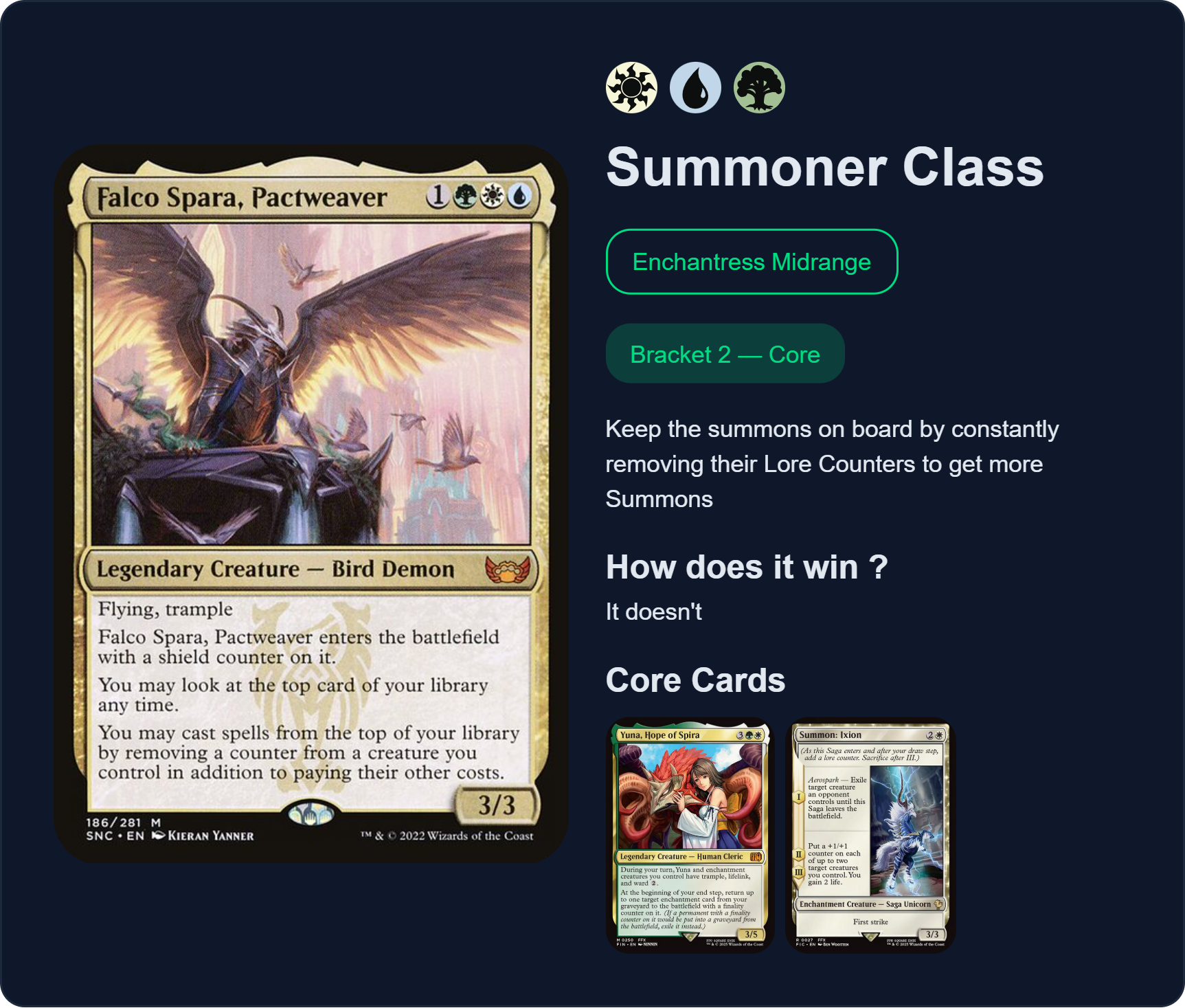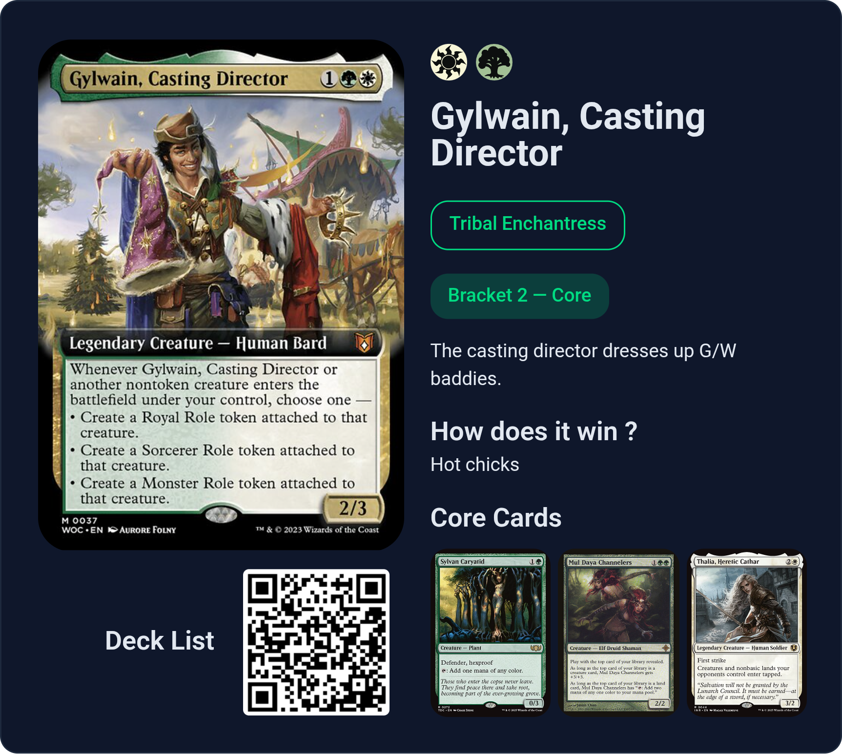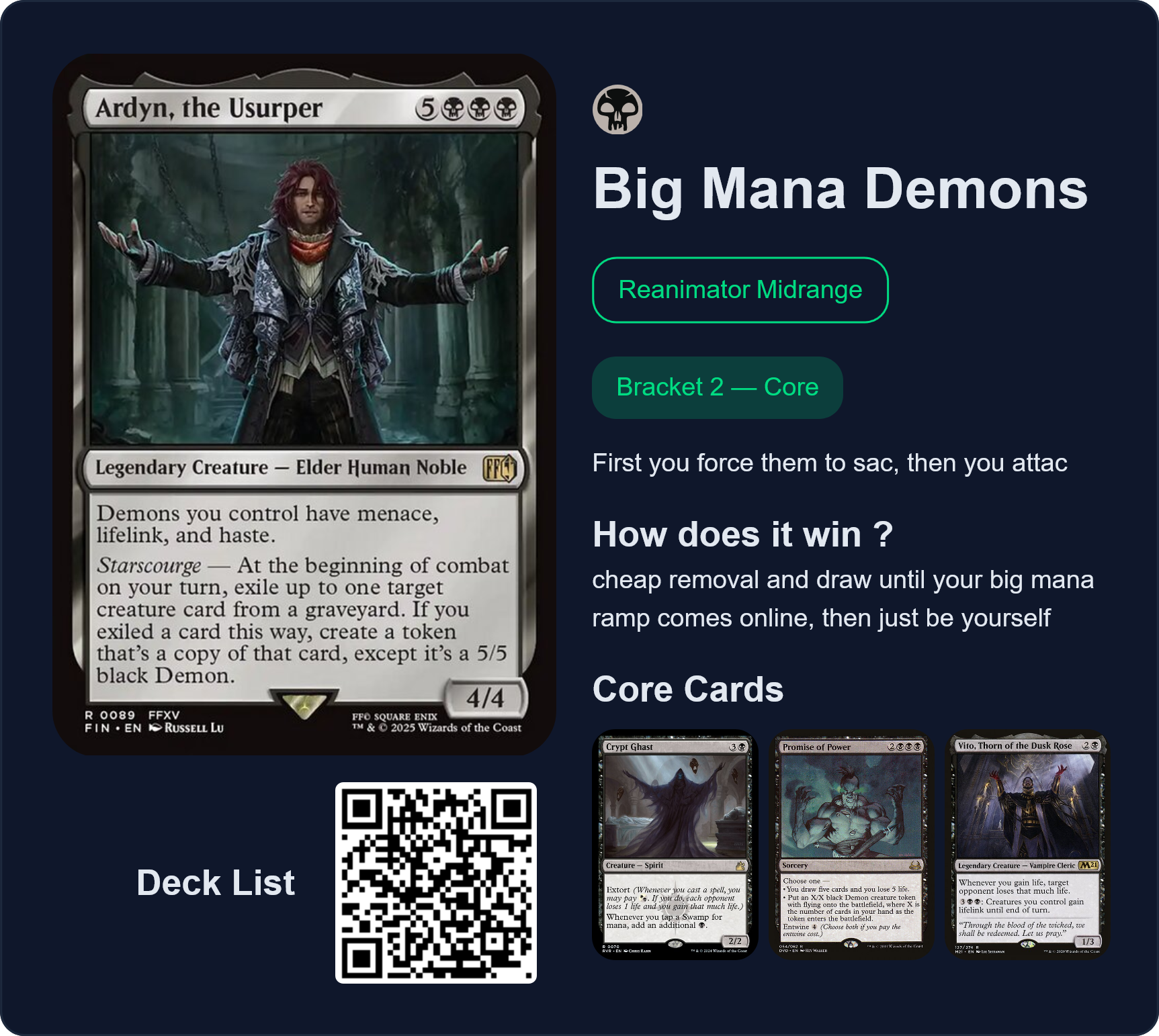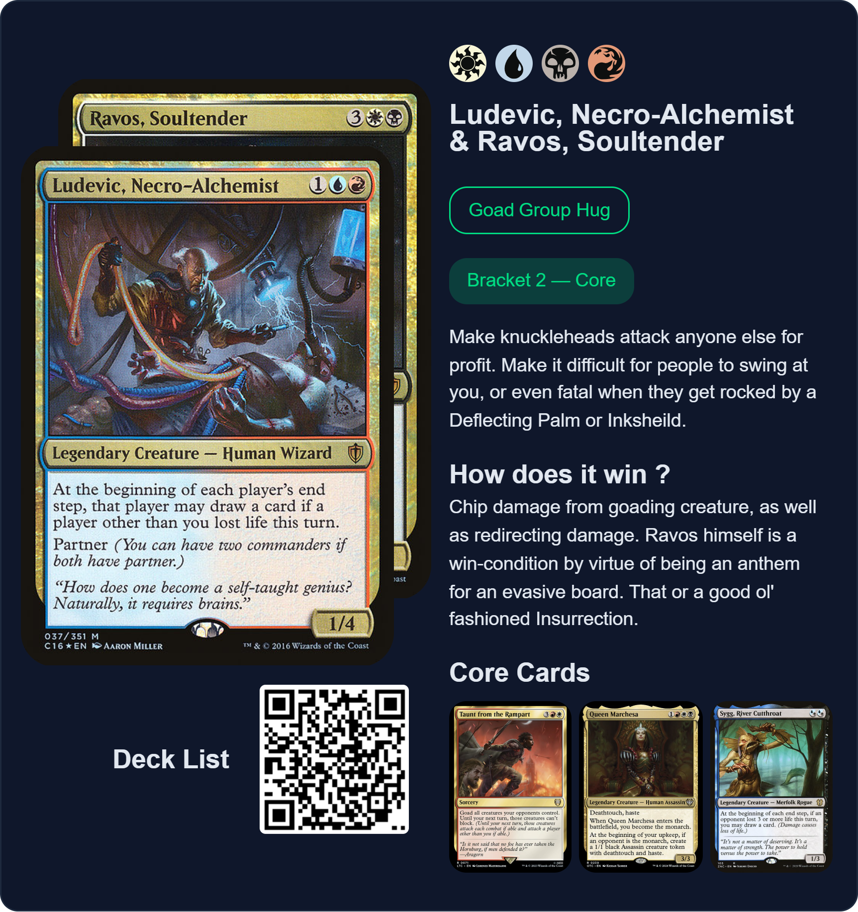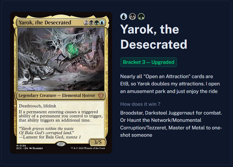 Previous >>97735584>Most recent banlist updatehttps://magic.wizards.com/en/news/announcements/commander-banned-and-restricted-february-9-2026>Most recent bracket system updatehttps://magic.wizards.com/en/news/announcements/commander-brackets-beta-update-february-9-2026>Outline article introducing the bracket systemhttps://magic.wizards.com/en/news/announcements/introducing-commander-brackets-beta>Current banlisthttps://magic.wizards.com/en/banned-restricted-list#commander-banned>Gay Bolashttps://e621.net/posts?tags=nicol_bolas>Former Commander website, where you can learn the basics, and read the format philosophy laid down by the rules committeehttps://mtgcommander.net>Statistically see what everyone else puts in their commander decks based on what is posted to the internethttps://www.edhrec.com>Learn about PDH, Commander's budget pauper formathttps://pdhhomebase.comhttps://www.pdhrec.com>Deck list site: You can search for decks that other people have made. Authors often have comments that explain their deck strategy and card choiceshttps://www.archidekt.comhttps://www.moxfield.comhttps://www.tappedout.net>Find out what lands you can add to your deck, sorted by category, based on a chosen color identityhttps://managathering.com>Card searchhttps://scryfall.com>Proxy a deck or a cube for cheaphttps://pastebin.com/9Xj1xLdM>Preconshttps://magicprecons.comTQ: What do you think of Grandeur?