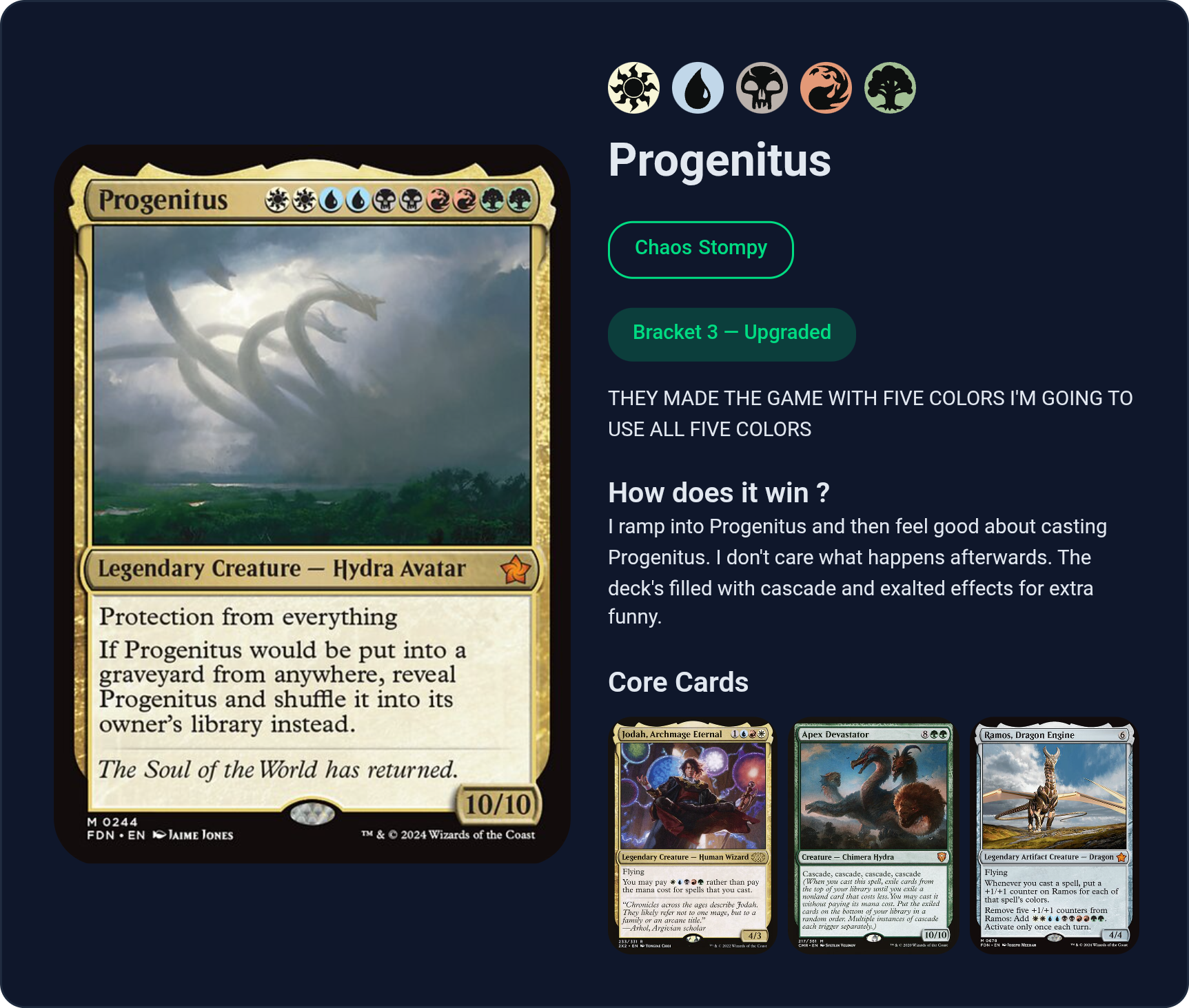 >>97757313He's not as good as the regular jellybean, but he can be fun. He requires you to lean heavily into WUBRG spells that you can semi-cheat out with his ability. Ideally you want spells that are 3CMC in 3 colors so you can play them for free. You can also go the alt route and just bank up all the mana as black mana to slam with after a few turns.