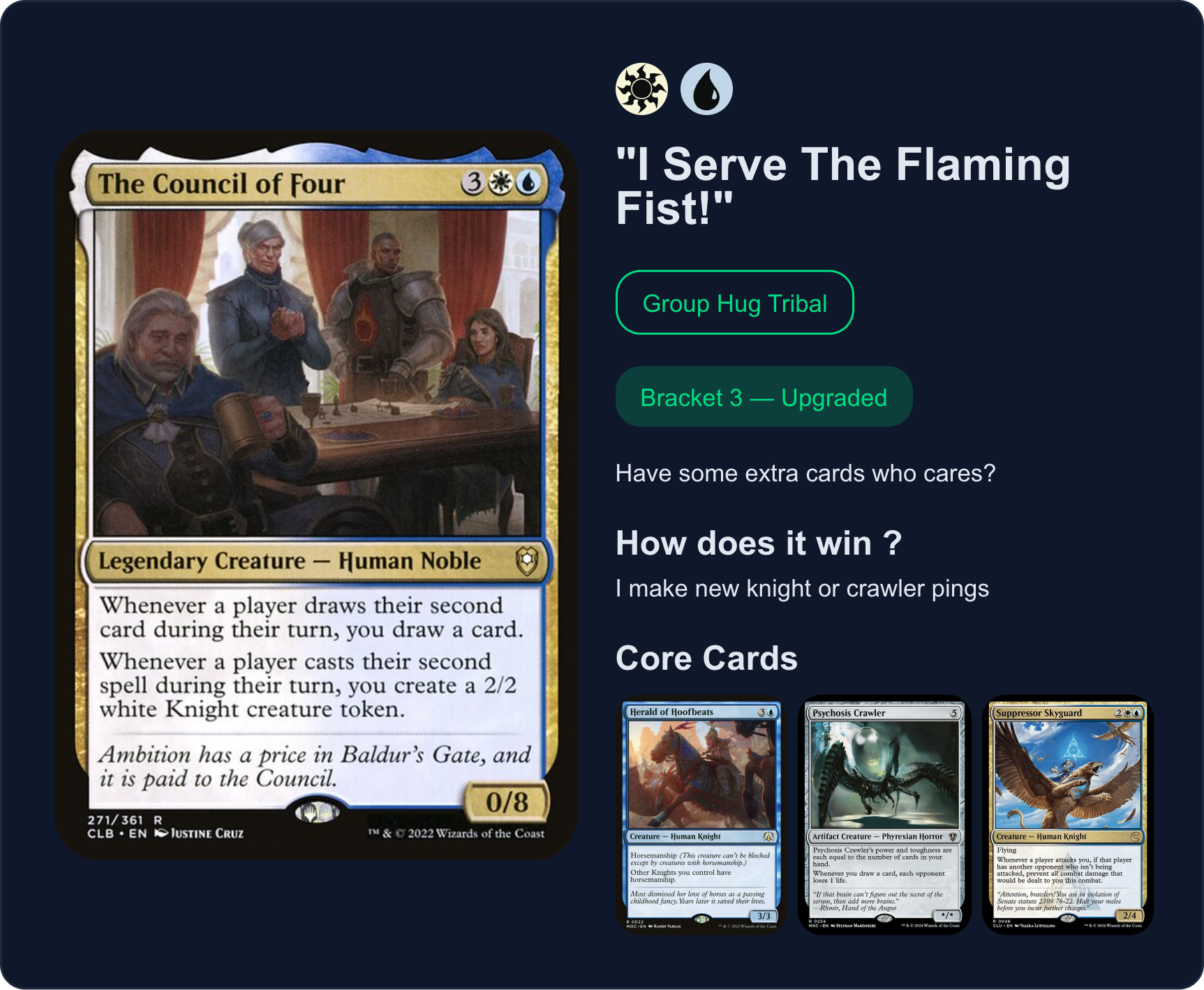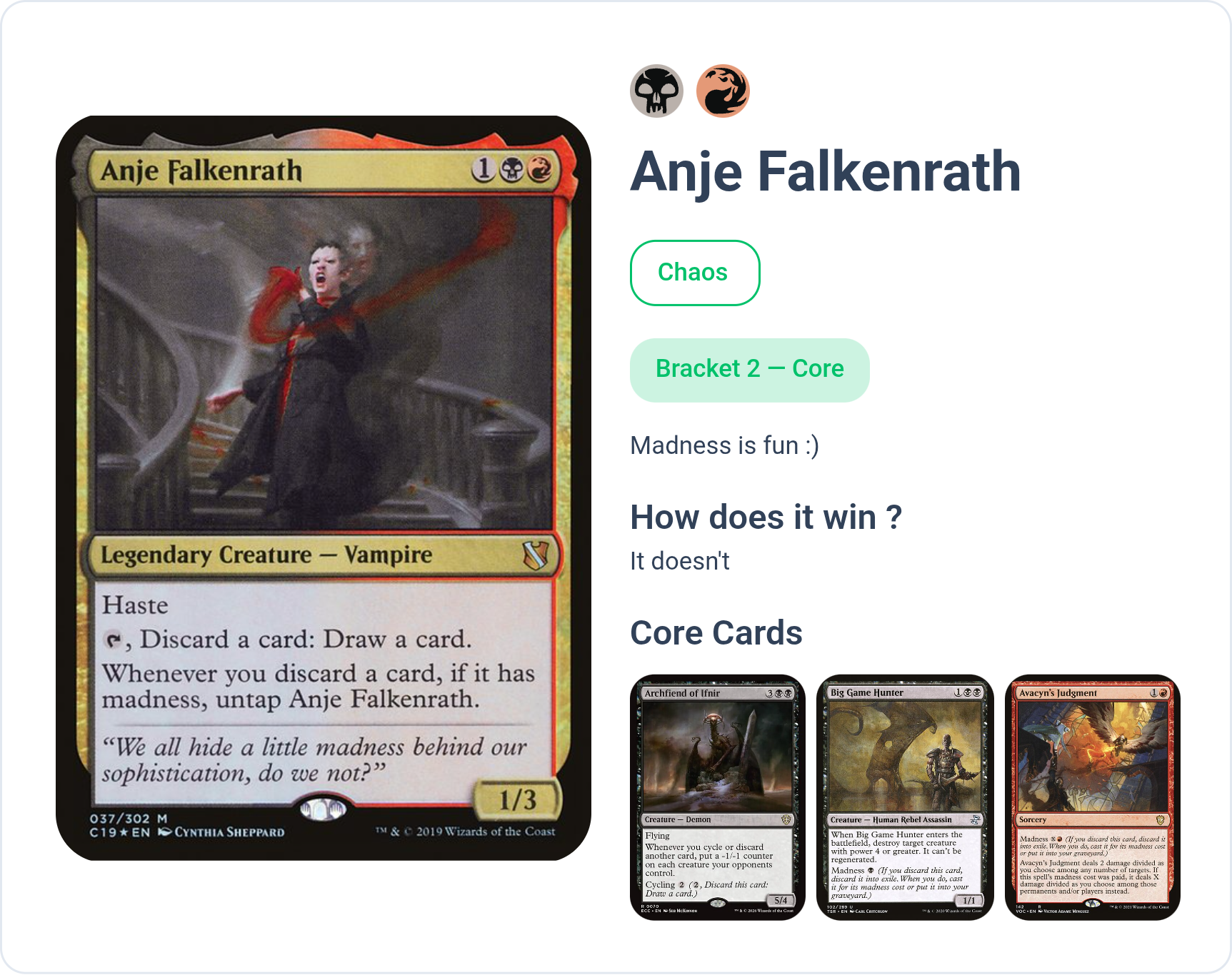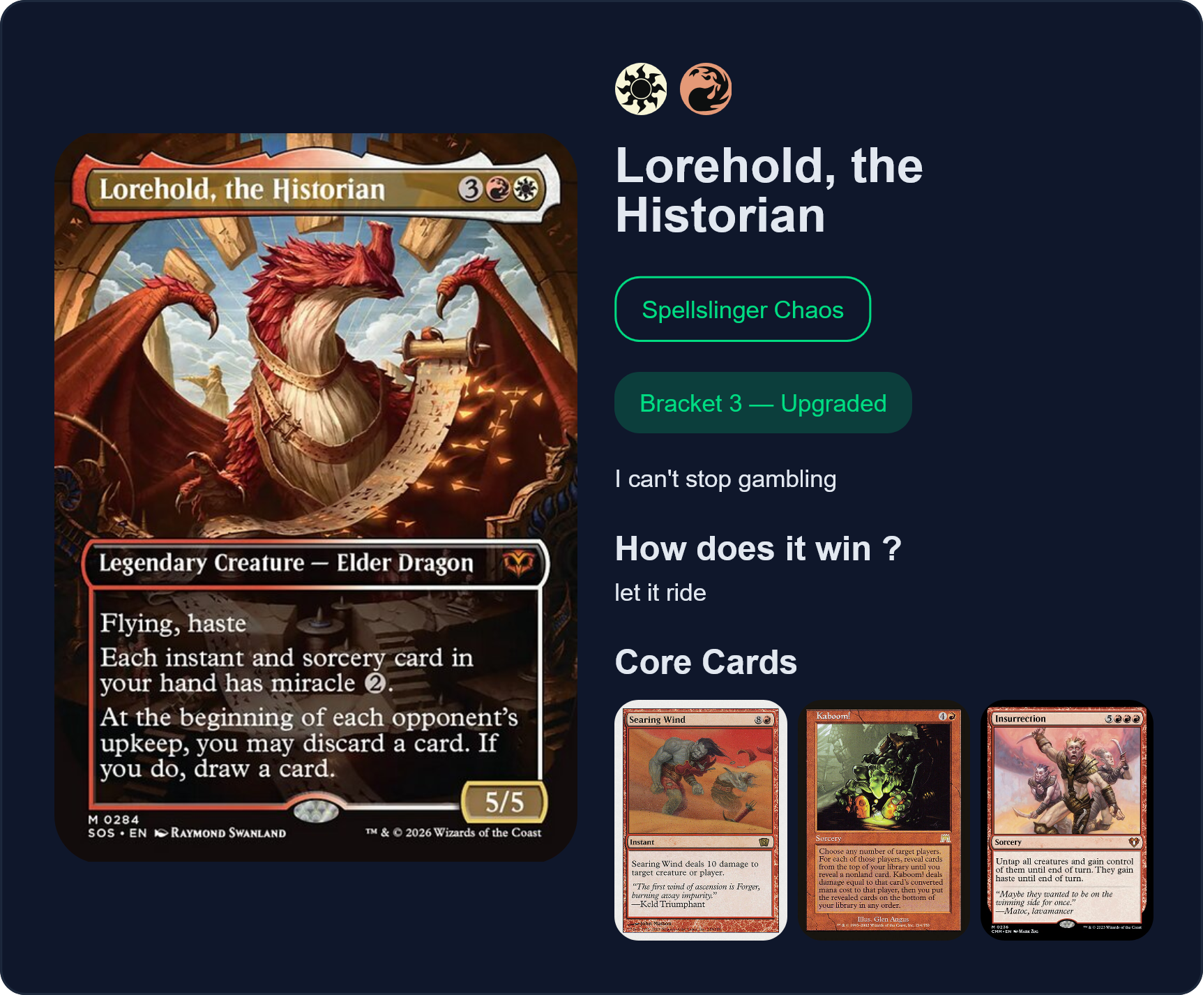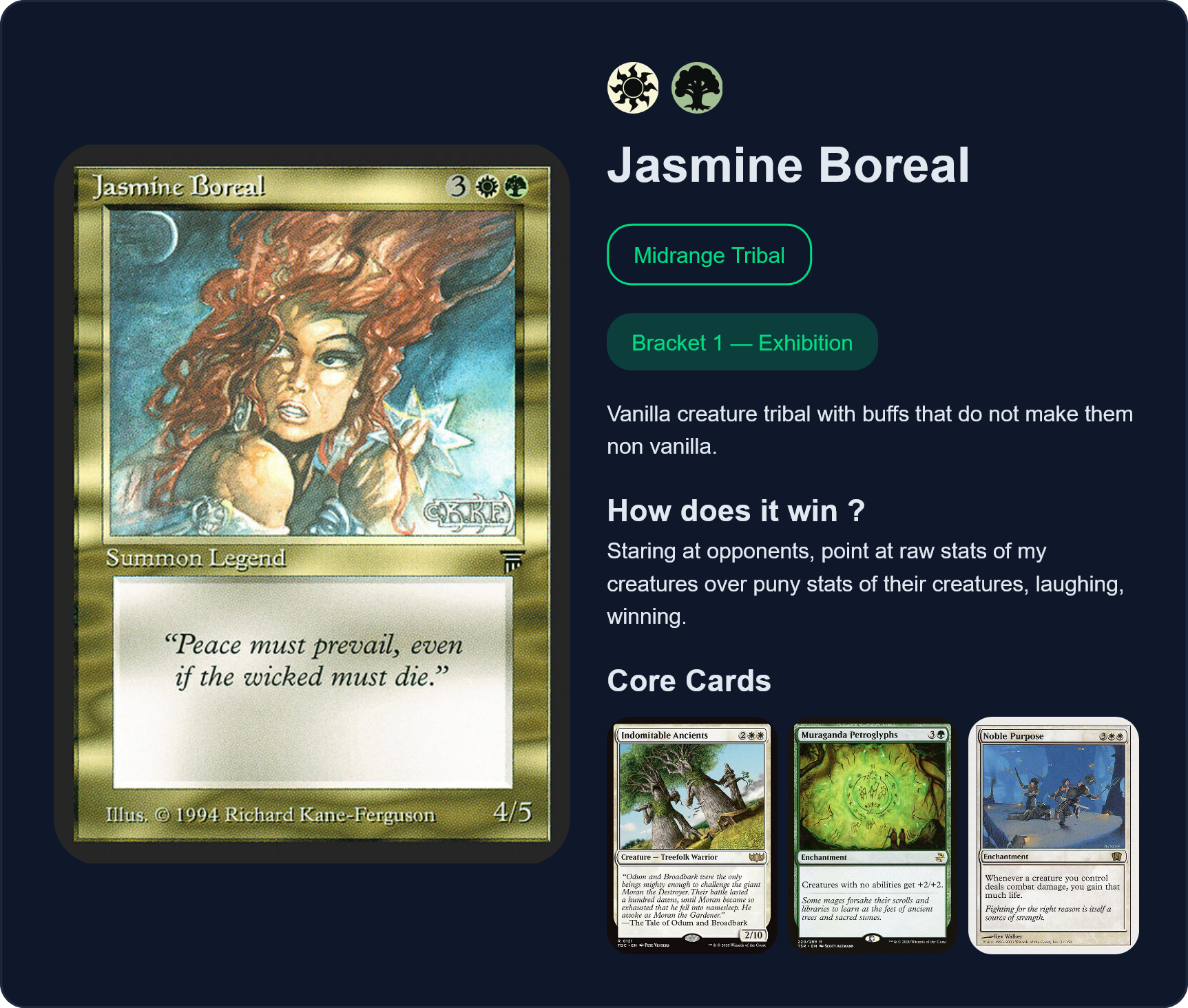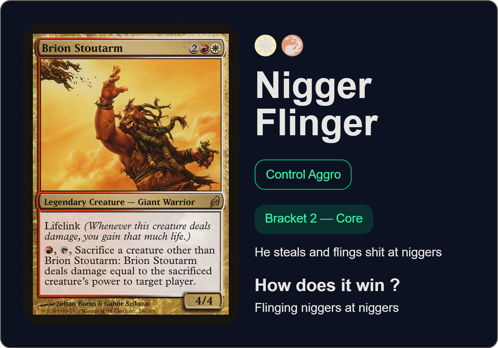 >>97761360NO>>97761676NOVEL GIMMICK DECK THAT CAN ACTUALLY WIN, ABSOLUTELY APPROVED>>97762153THIS IS JUST ONE OF THOSE COMMANDERS WHO YOU KILL EVERY TIME OR LOSE WHEN THEY ENTER MAIN PHASE 2, NOT A FUN GAME STATE AND (NOT) APPROVED>>97762377YOU CAN PASS BUT YOUR COMMANDER IS ONE OF THE DULLEST PRECON FACE LEGENDS OF ALL TIME>>97762474PASS BECAUSE GOBLINS ARE INOFFENSIVE BUT KNOW YOU'RE JUST A XEROX COPY OF 5 MILLION OTHER GOBLIN PLAYERS>>97762628SIMPLE AND STRONG BUT YOUR CORE CARDS REPRESENT THE DECK AS PRETTY GENERIC SULTAI STUFFYOU CAN PASS BUT YOU CAN BUILD HIM MORE INTERESTINGLY>>97762803REPETITIVE COMMANDER WHO DOES EXACTLY ONE THING OR LOSES BECAUSE HE GOT KILLEDYOU CAN(NOT) PASS>>97762989YOU ALMOST HAD A 9/9 APPROVAL BUT YOU JUST HAD TO USE STICKERS>>97763414ALWAYS APPROVE OF BRION BUT I'M NOTICING /edhg/ HAS A DISPROPORTIONATE ERECTION FOR BOROS>>97763721CITADEL + TOP _AND_ BRACKET 4 HELLNEVER EVER EVER EVER PASS