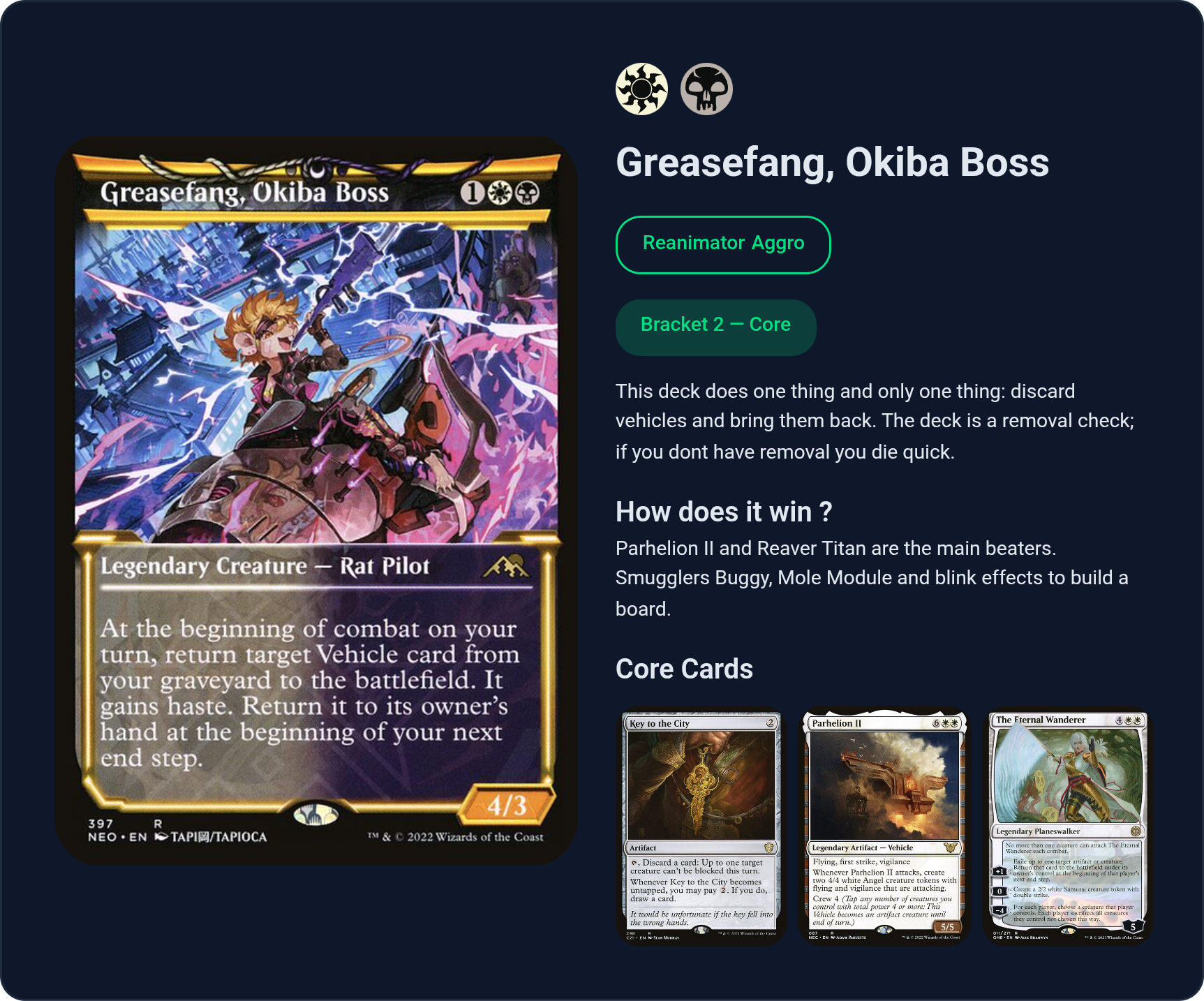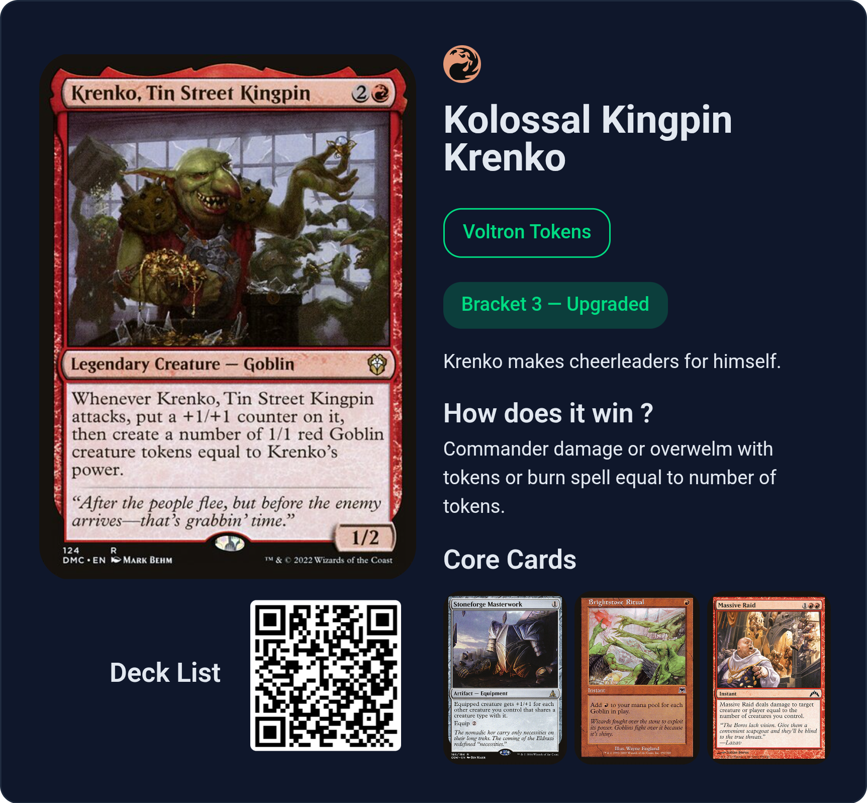 >>97763810>you're a copy of other goblin decksBut it's a voltron deck, there is next to no tribal anything, there are no creatures in the deck. The goblin token are 90% of.the time cheerleaders to make krenko swole and blockers.