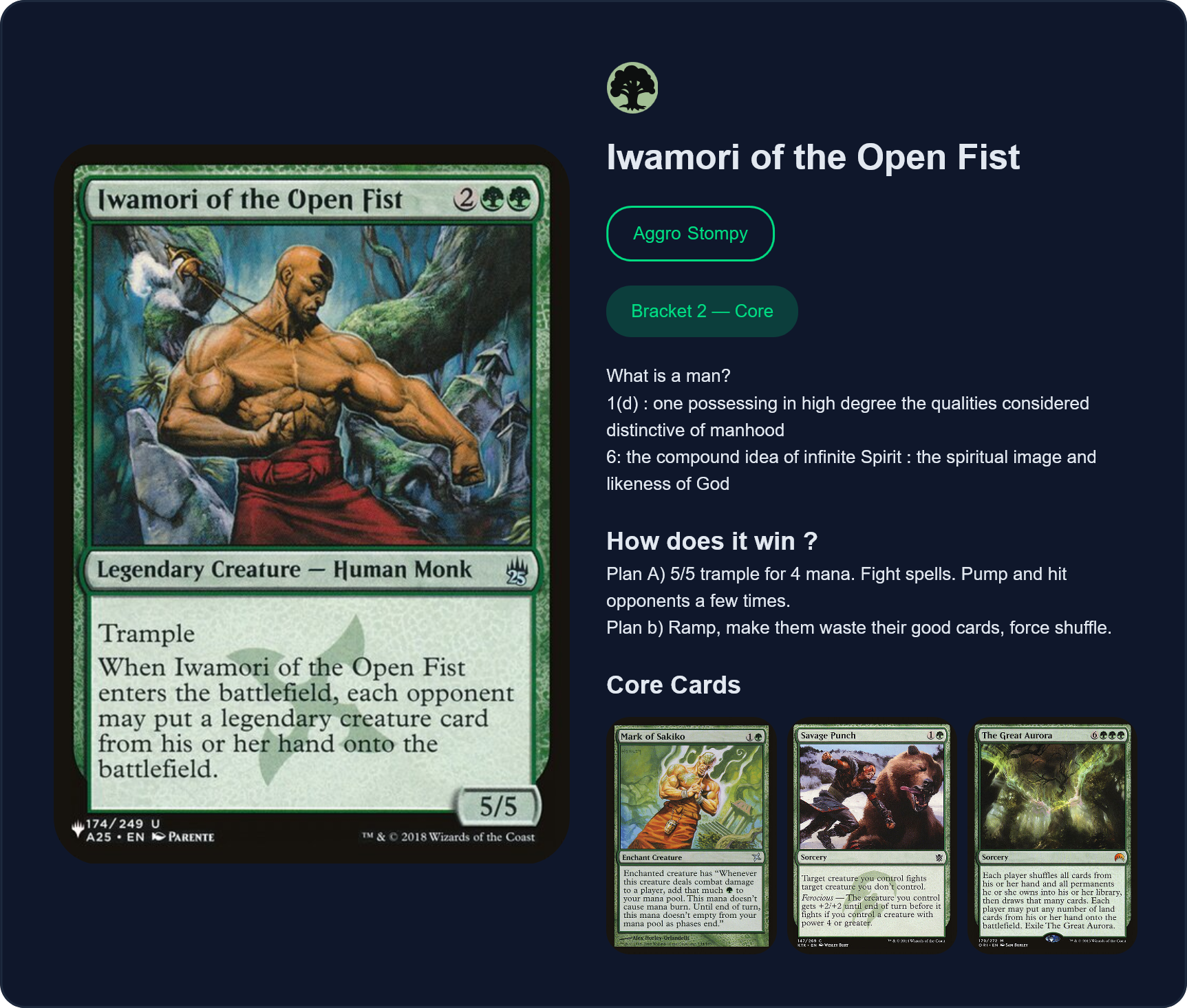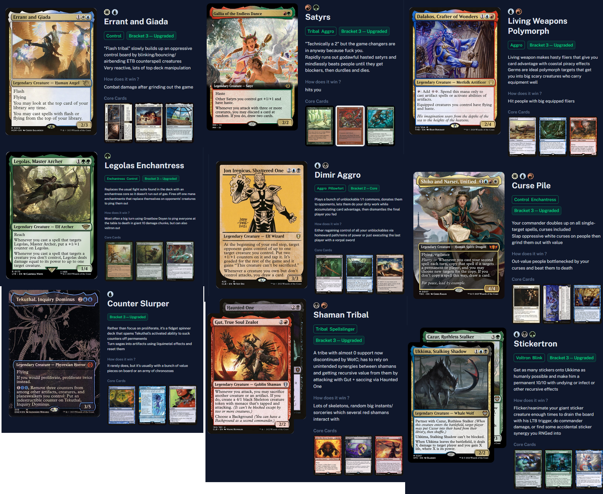 >>97757548>Excessive tutors>poor tutor targets>any mention of content creators in the about section >anything tagged competitive>bad puns or references in the name of the deck The last one is the hardest to nail down but you know someone lacks creativity when you see certain deck names, especially anything with "Boogaloo" in the title.