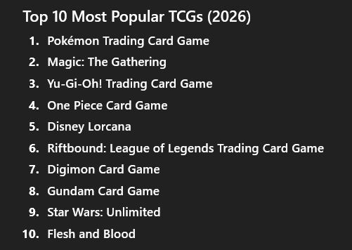 Out of Season Snow Storm EditionHere is a thread to discuss trading card games other than the big three.>Build Divide>Force of Will>Final Fantasy TCG>DBZ CCG>Wixoss>Keyforge>Gundam>Legend of the 5 Rings (L5R)>Digimon>Flesh and Blood>Gate Ruler>Battle Spirits>Ashes>One Piece>The other DBZ game>Sorcery>Doomtown>Warlord>Magi Nation>Lord of the Rings>Neopets>The Condemned CCG>Grand Archive TCG>Disney Lorcana>Hubworld: Aidalon / Earthborne Games>Little Troubles>Riftboundetc.Post about card games you've played and help other anons get to know your games!Pastebin/Rules for some games>Wixosshttps://pastebin.com/LC8SpttH>FoWhttps://pastebin.com/aGEBEKeF>Dragonball GT SDhttps://drive.google.com/file/d/1Pj_0YeUXI5g4XyKwbAXJuZCGt3qWJwyp>Gate Rulerhttps://pastebin.com/nbcZP0nB>Build Dividehttps://pastebin.com/1cQT2pkz>FaBhttps://rentry.org/oypcs>Ashes Rebornhttps://pastebin.com/2jr0EG9S>Netrunnerhttps://pastebin.com/g3yQAQ7w>Fusion Worldhttps://www.dbs-cardgame.com/fw/pdf/rules/fw_OfficialRule_Manual_en_v1.00_2.pdf>Various Japanese CCGs without western translation (page is in moonrunes)http://card.g1.xrea.com/tcg/catalog.html>The Condemned CCGhttps://pastebin.com/Liu2E7Rqvoice chat for playing /acg/https://discord.gg/rCQFKcGcEP>Previous Thread>>97710055>Thread QuestionHave you ever played a card game out doors before?
