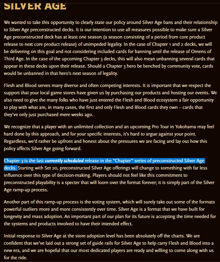 New BNR dropped from LSS and it's a doozy.>admit classic constructed is perfect, no need to balance it as this is the best state the game's ever been in (lmao) >furthermore, they are not going to be banning cards in chapter starter precons until after they've had one whole competitive season (typically 3 months) and then they will be forced to ban things for the safety of the format >let the cat out of the bag that Chapterdecks failed and will not be continuing past part 3 >pat themselves on the back for how well silverage is going despite overtuned juggernauts ruining its balance and the worst performing new player onboard product in their history I give it until the end of the year and then this format is done for. Well done, that was a record, James.