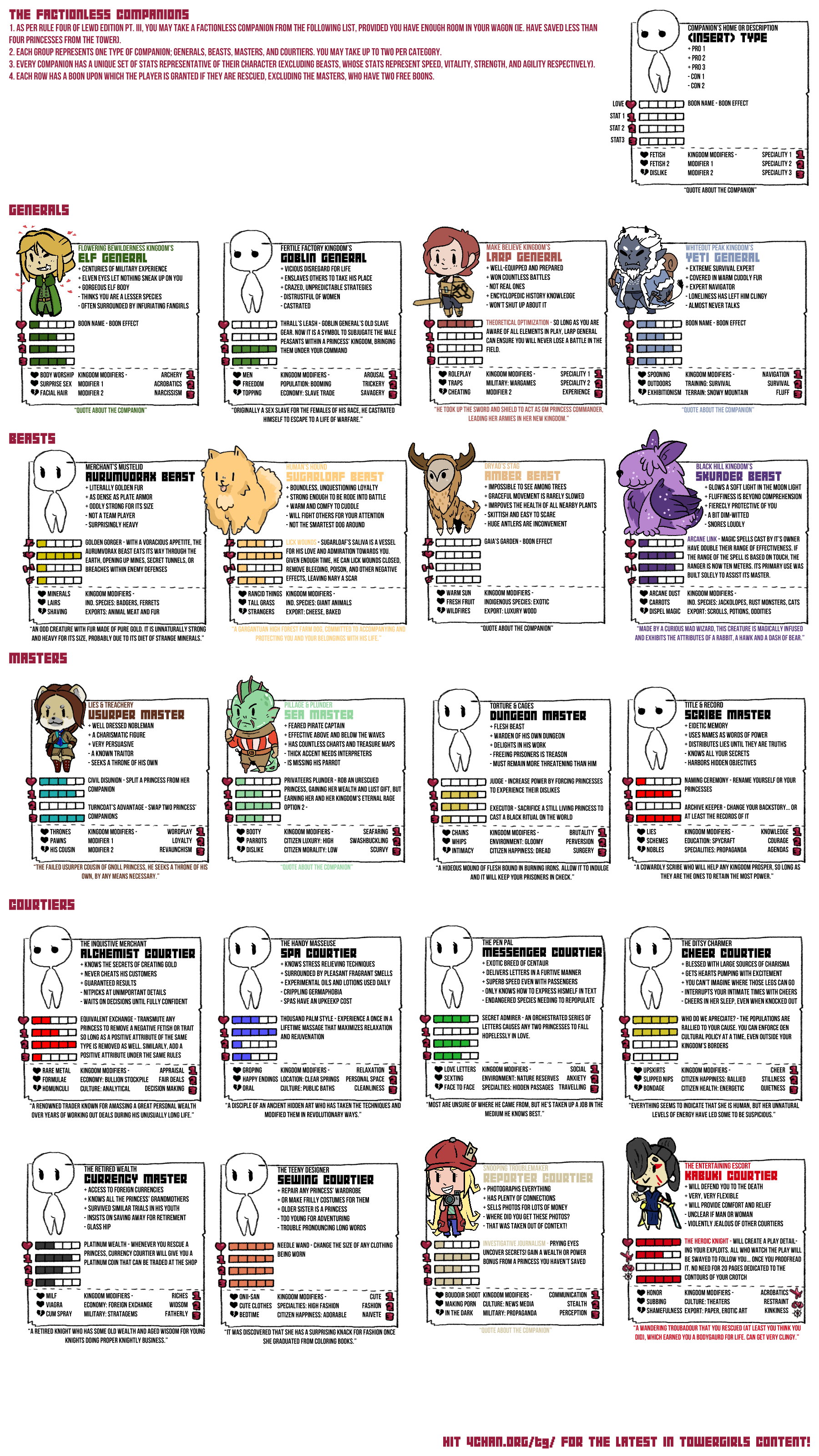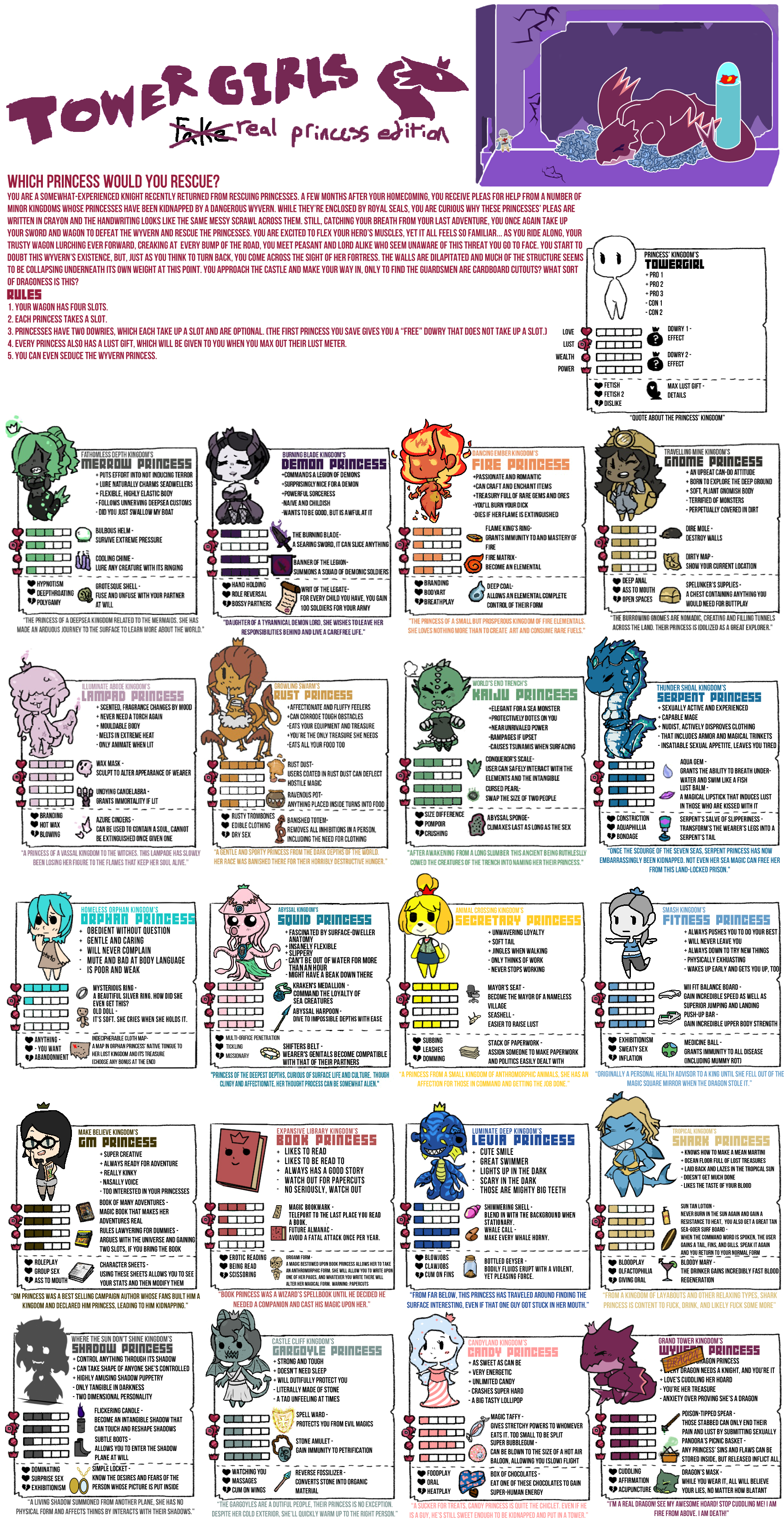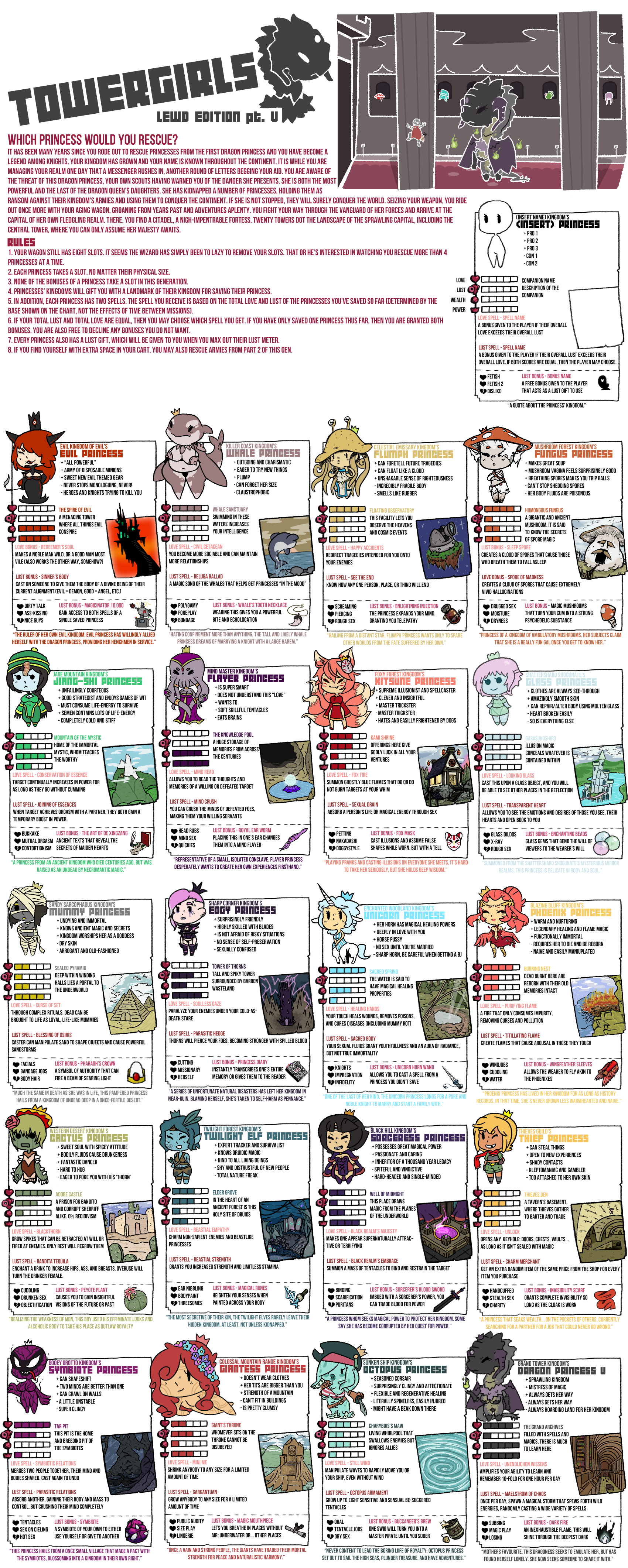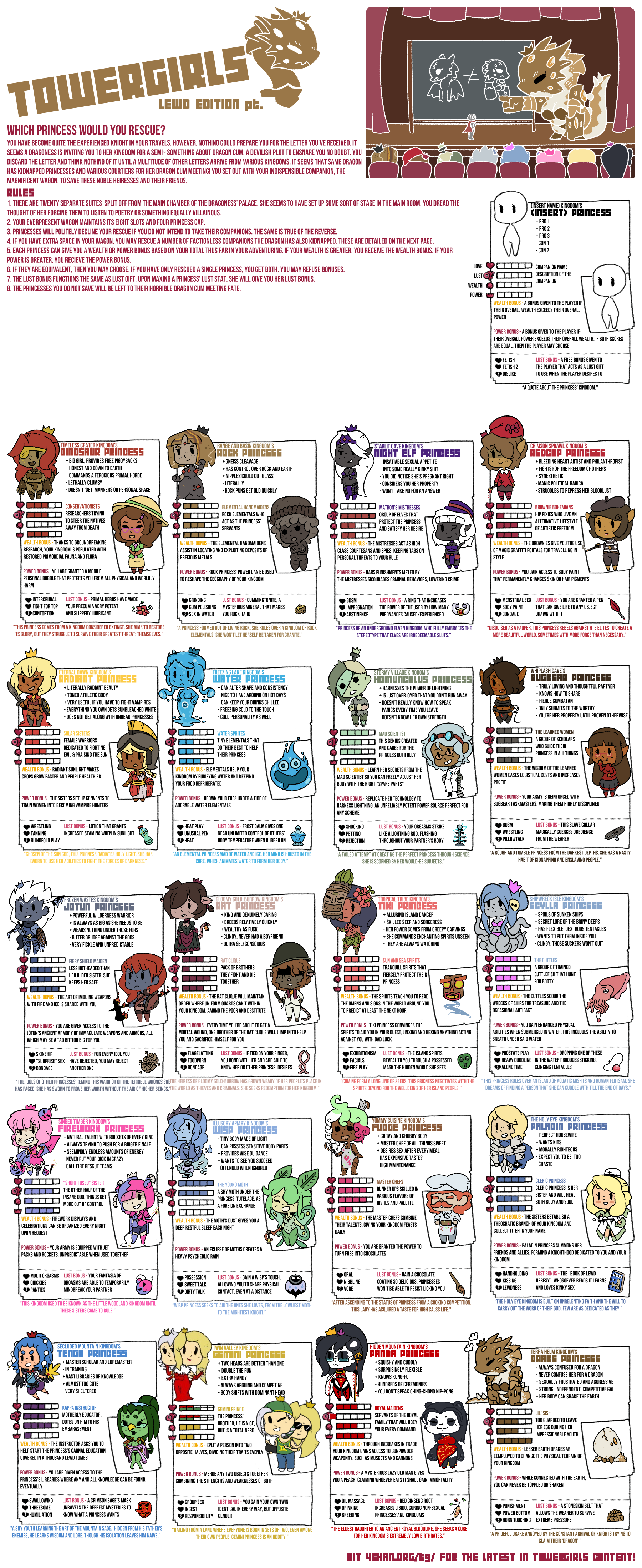 Dragon Princess Tracking EditionDiscussion of the Towergirls CYOA, RPG, Setting, or Video Games welcome here!Everyone is welcome.FAQhttps://pastebin.com/vv4xQuwDCharts:Main Gens: https://e-hentai.org/g/2556775/f1669e072b/Imgchest backups(not sorted): https://imgchest.com/p/na7ko9dky8dhttps://imgchest.com/p/pg73rmbv7rnLegacy Charts: https://imgur.com/a/IRtoHXhSide Quests: https://imgur.com/a/7euVXRTExiled Lands: https://imgur.com/a/p7AbcXJAlternate Costumes: https://imgur.com/a/xyF47FPNyx's Fusions: https://imgur.com/a/d6eLwXkFan V4 Gen:https://imgur.com/a/ddgAGTUGats's V4+Chibi Gen:https://imgur.com/a/xSMExqhV4 World Map:https://imgur.com/a/KMVGo3fDiety Writeups:https://pastebin.com/MUpQvNEqCommissions:https://imgur.com/a/8mAmCgRResources:Booru (Fan Art Collection) - http://tower-girls.booru.org/Backup Booru -https://towergirls.booru.org/index.phpBrushes, Fonts, and Templates - http://www.mediafire.com/file/k83sgc5t5dfvv3s/Towergirls_Files.zipGats Wiki - https://the-official-towergirls.fandom.com/wiki/The_Official_Towergirls_WikiFolder Containing Artwork - https://drive.google.com/open?id=1GCjgb8zXq2Myg8G39EockjdTTYShOQjwGames & Tabletop Rulebooks:https://mega.nz/folder/gZlSHAgT#w3aVD2Qyr1C0zdV4psc9EAQuests:https://wizdingo.proboards.com/ (Eversor)Where do I upload to share?https://catbox.moe/If you'd like access to the discord or have anything you wish to talk about privately involving towergirls, editing, etc, please contact Brumus here:A) Broken-Tower@hotmail.comB) "Tired Knight" on SteamPrevious Thread: >>97386183