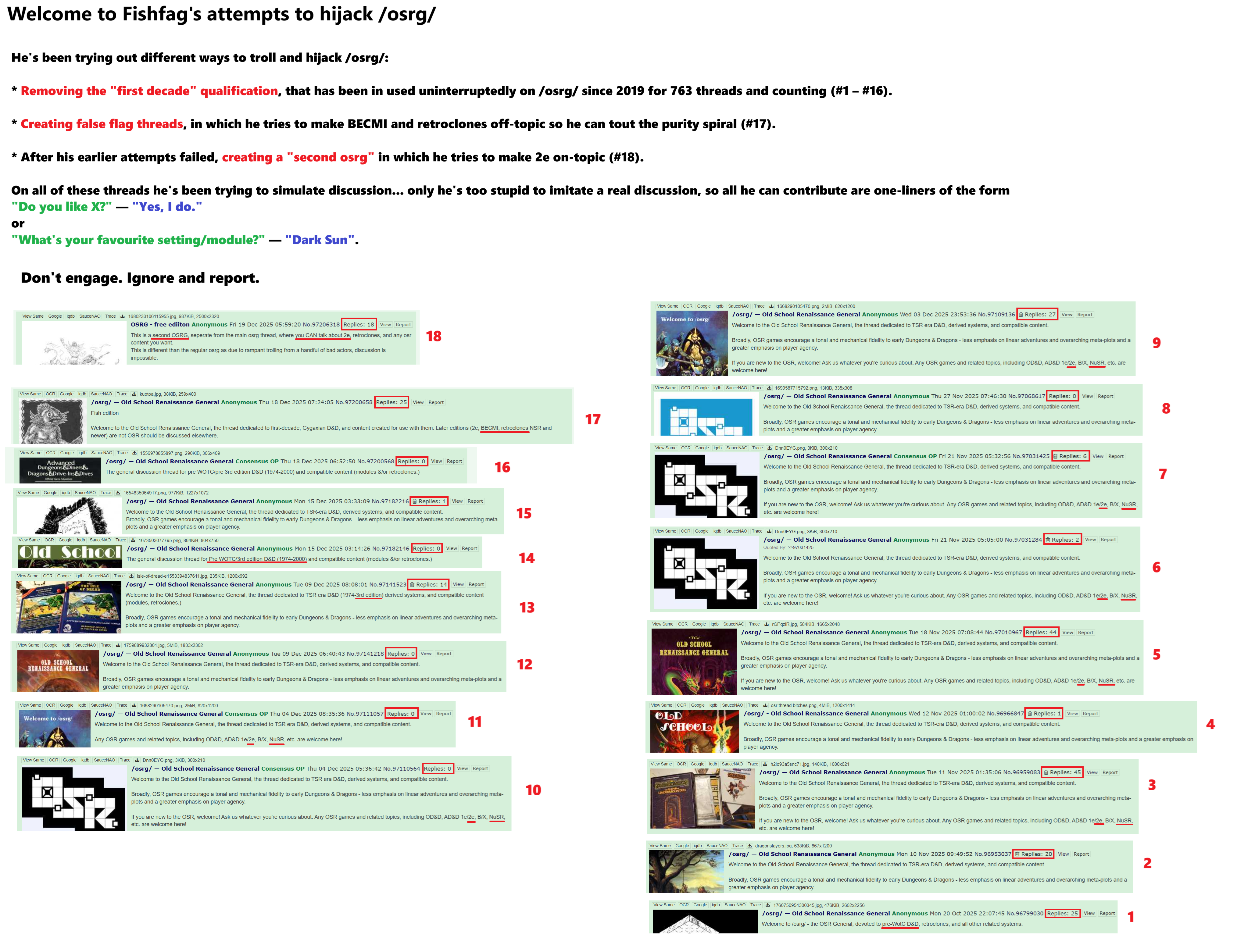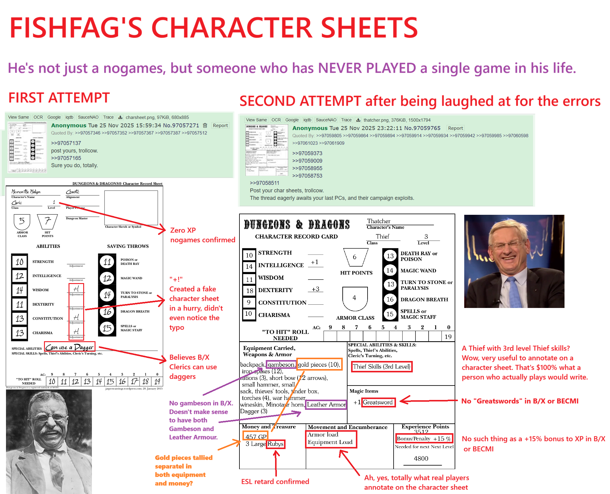 >>97788930I don't think it's possible to "get mad" when reading that kind of meltdown.It's one of the funniest spazz-outs ever seen on this board, the culmination of a what happened when a genuine shill tried to promote ACKS during its kickstarter in the /3eg/, and instead of succesfully pitching the game to anyone he was bullied mercilessly. That's genuine emotion coming from the little sperg, and it's all directed at a fictional entity he created because he couldn't cope with the idea that more than one person might find his story to be dull.We might be at the point where his continued shitposting is just to try and erase the shame he feels whenever he's reminded of how badly he embarassed himself, which is even more funny because it just keeps adding to that shame.