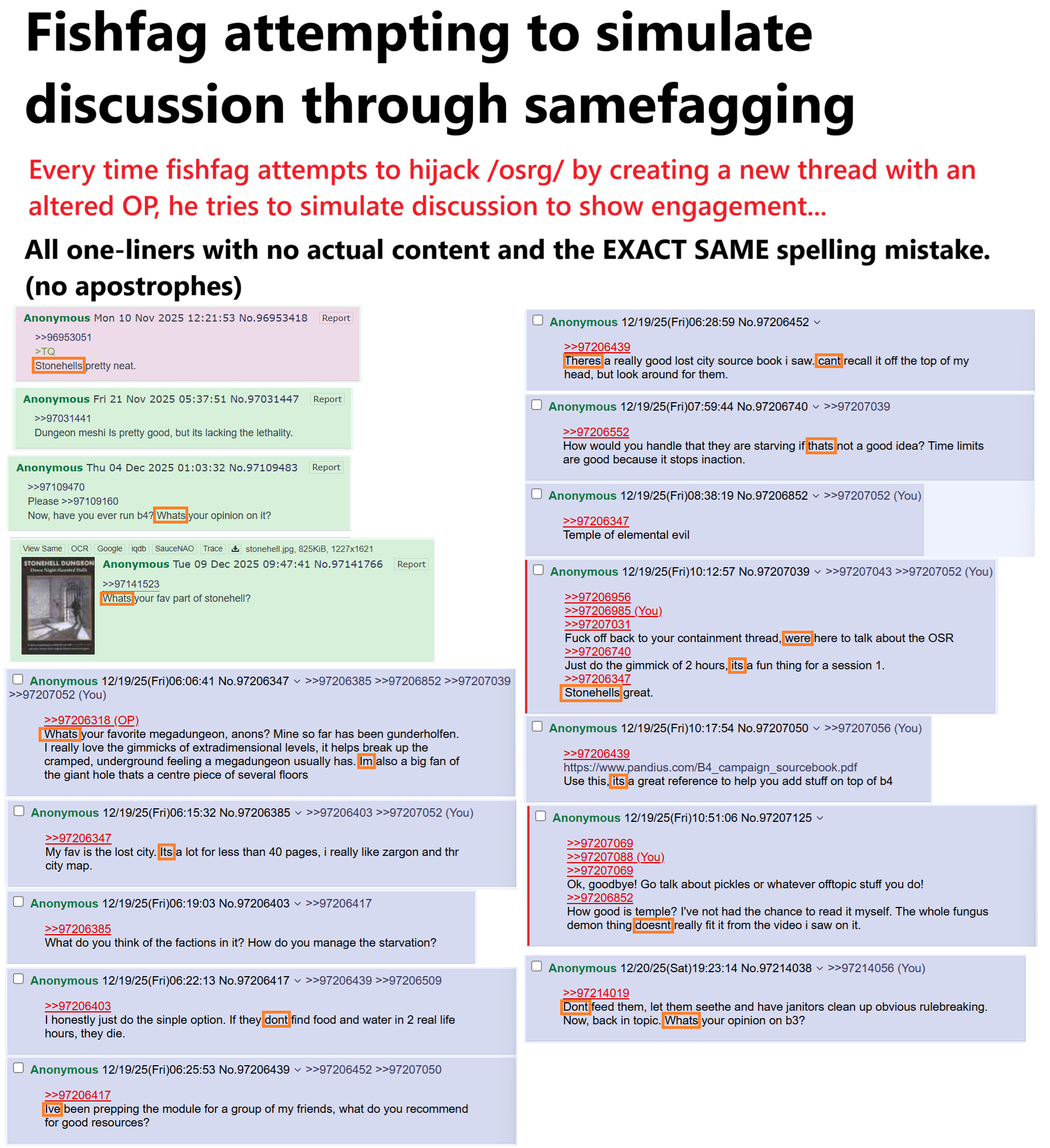 >>97789224If you can't handle people calling a system shit without having meltdowns for hundreds of posts where you try and claim everyone you don't like is one guy, you might want to find an actual hugbox to crawl into.People are going to call ACKS shit because it's a mediocre game played by some pretty awful people like yourself, and no one is intimidated at all by the idea that if they call your game shit you'll spazz out and call them something like "fishfag." How you ever thought that strategy would work is beyond me.