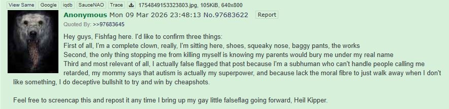 >>97791276NTA, but you endlessly insisting on repeating your "it's all one guy" lie isn't helping you. Not even you believe it.All it's done is... 200 posts, 200 posts of you shitting yourself, and all it's done is show how much a shitbag you are in case anyone needs proof. You really have a bad habit of not realizing how badly you've embarrassed yourself until it's far too late. But, you'll just try to claim this whole thread was just a falseflag, I bet.On a serious note, I genuinely meant it when I said "good luck" to overcoming your brain demon. But, I also meant it when I said that you're probably fucked.
