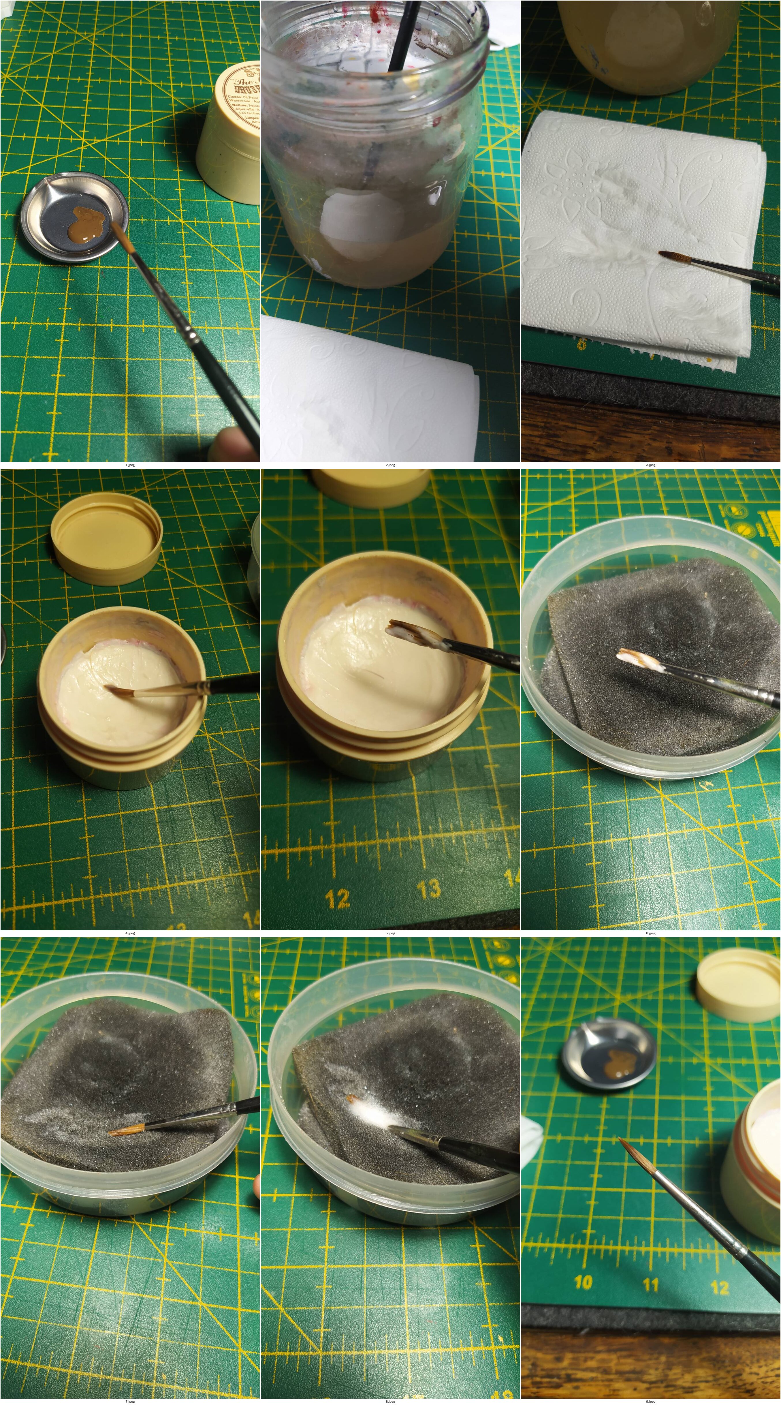 >>97768428Droplet of isopropyl alcohol on the brush, wick it off in a metal palette dish. Wipe it off on toilet paper if it's still got paint remnants, repeat until no more paint is visible on the toilet paper.